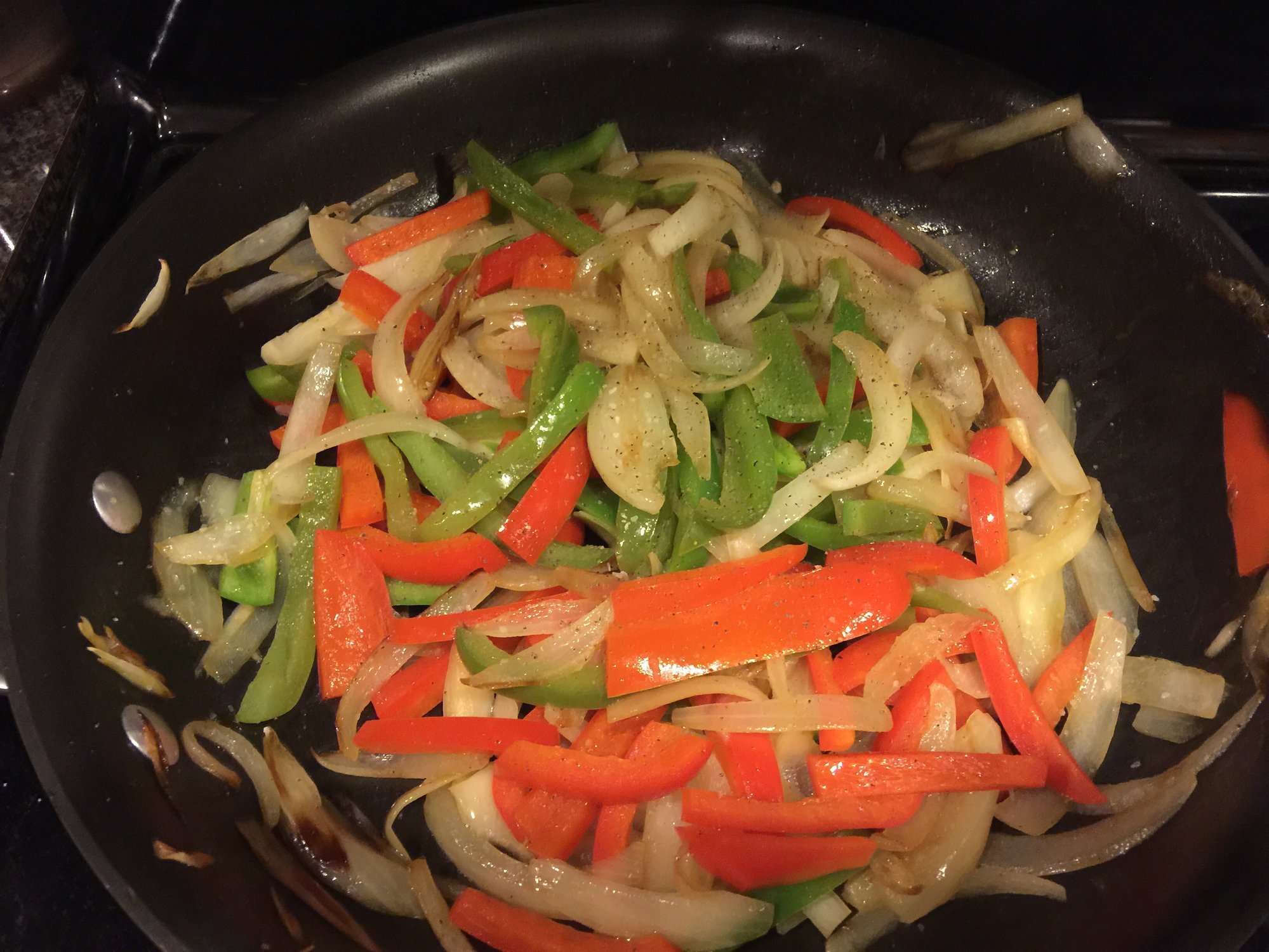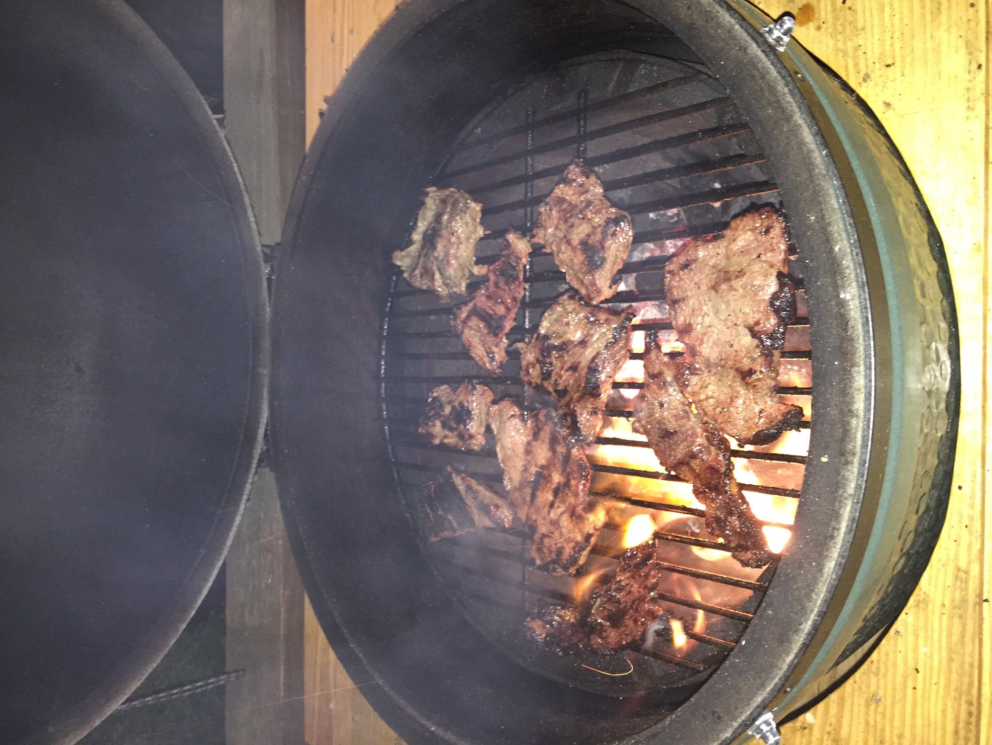 Marinated some skirt steak and Ribeyes in mojo while the egg came up to temp. Then seared at about 550 until nicely charred. Served on tortillas with peppers and onions.