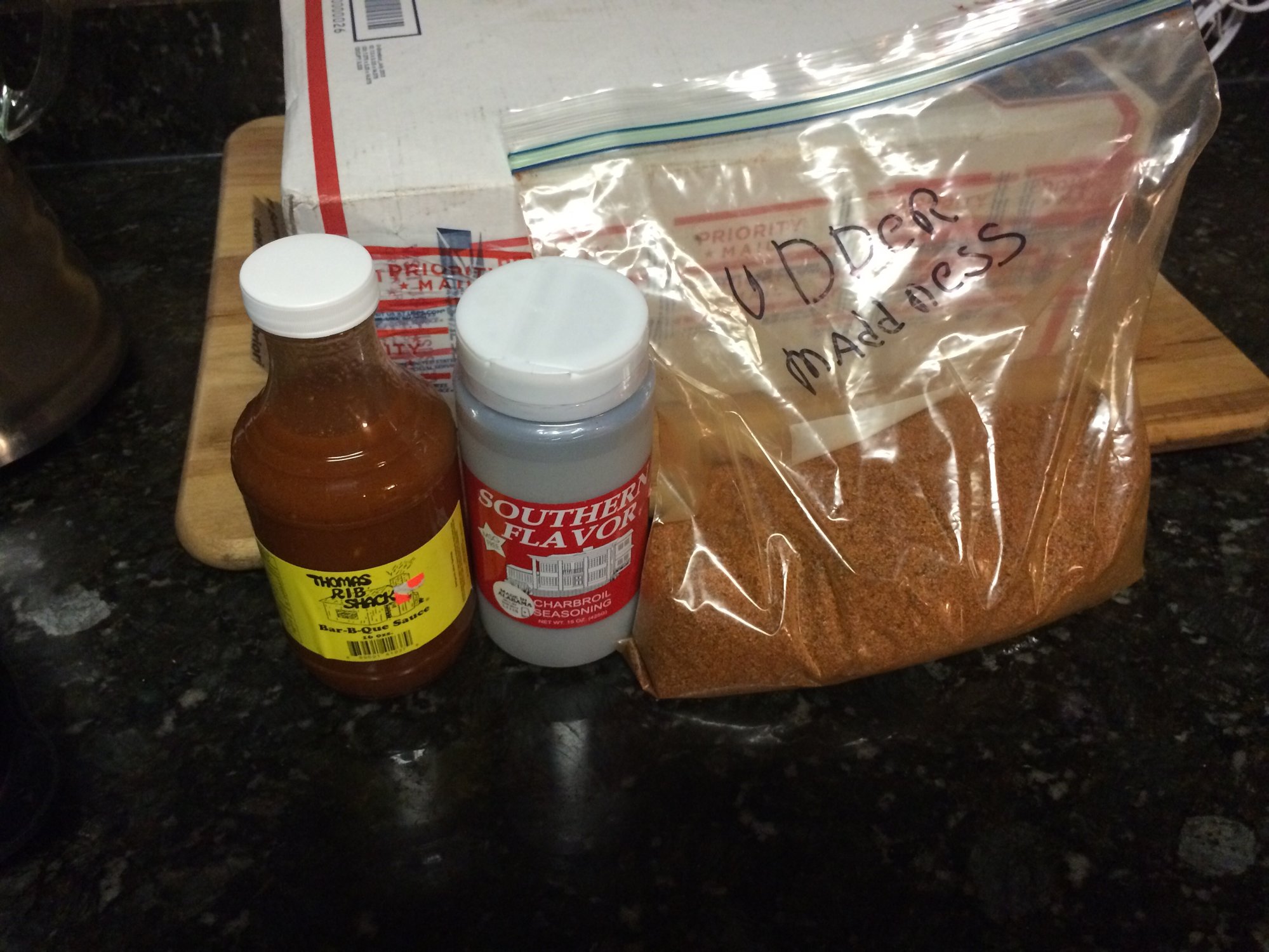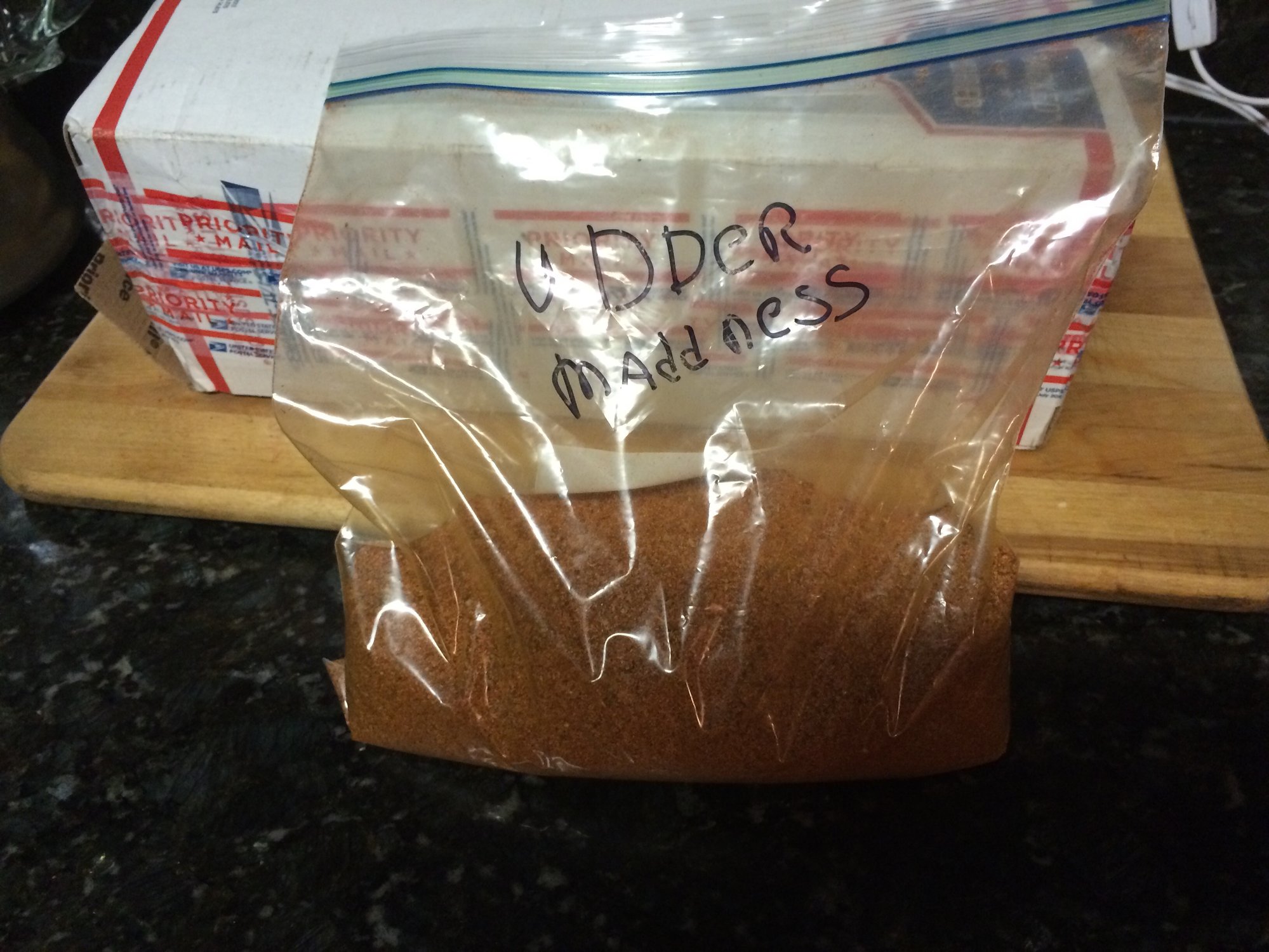 My first thought is that it is either from Cen-Tex or cazzy. Why? The first stamped postmark on it is Houston, Tx. Whomever it is from, I honestly really appreciate it. Going to give the home made rub a try this weekend either on a brisket or a small clod. Don't know if you can see it in the pic or not, but "udder madness" is wrote on the plastic bag with a magic marker.
