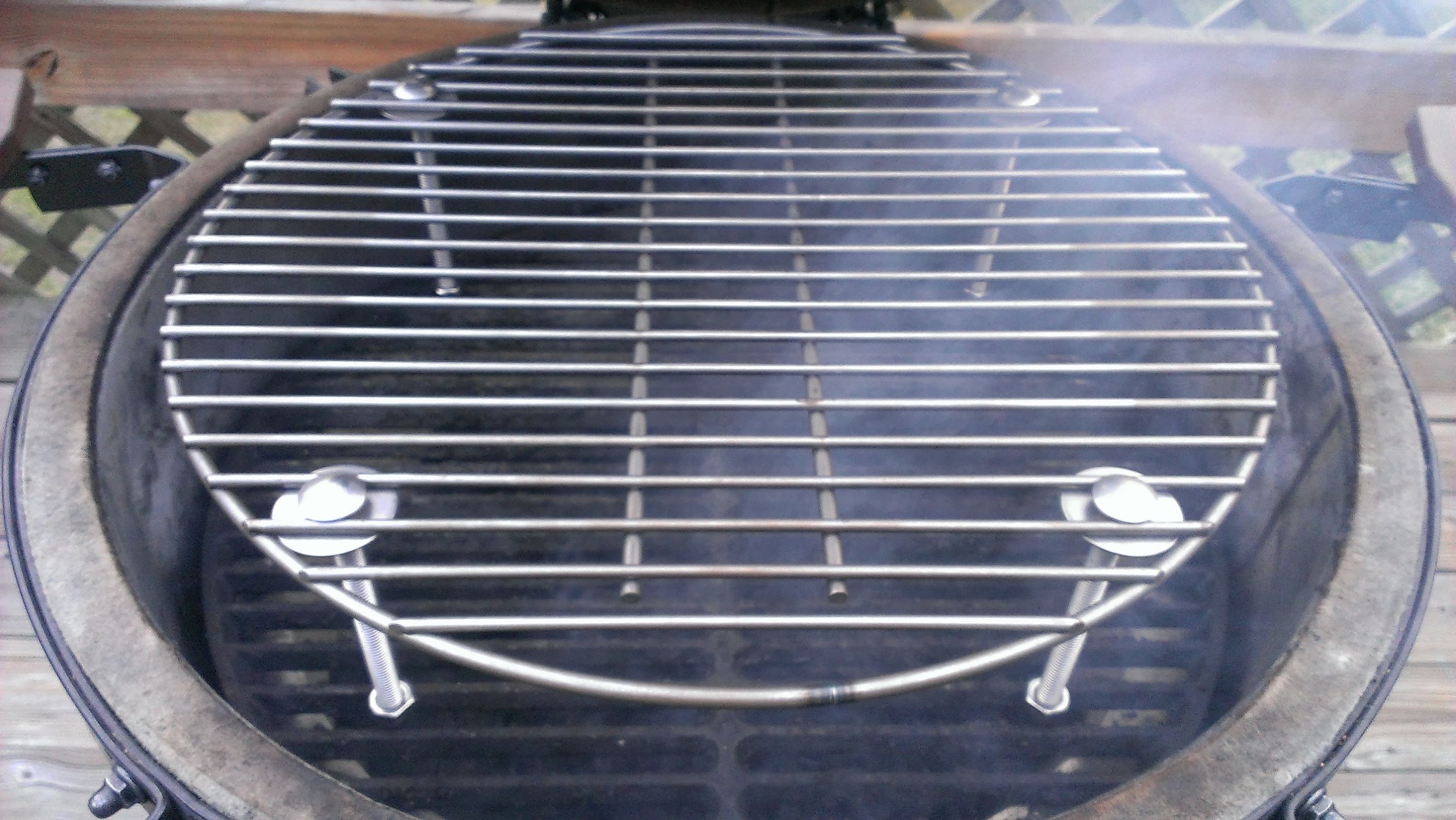 Grid on fire ring, second grid (smaller Weber cheapo) with three carriage bolt legs/stilts. Bolts stay attached to the small grid so I can lift the whole assembly out when needed.