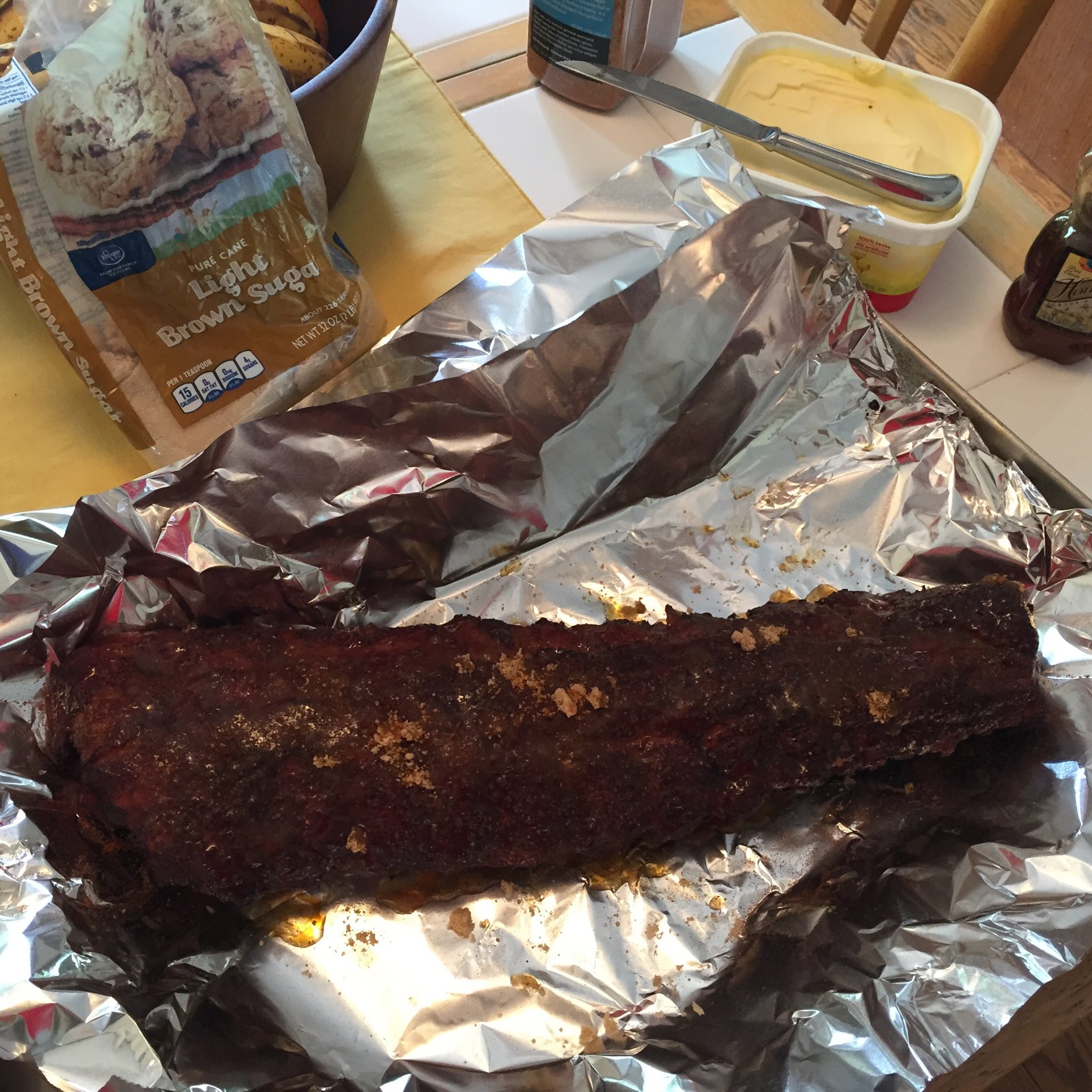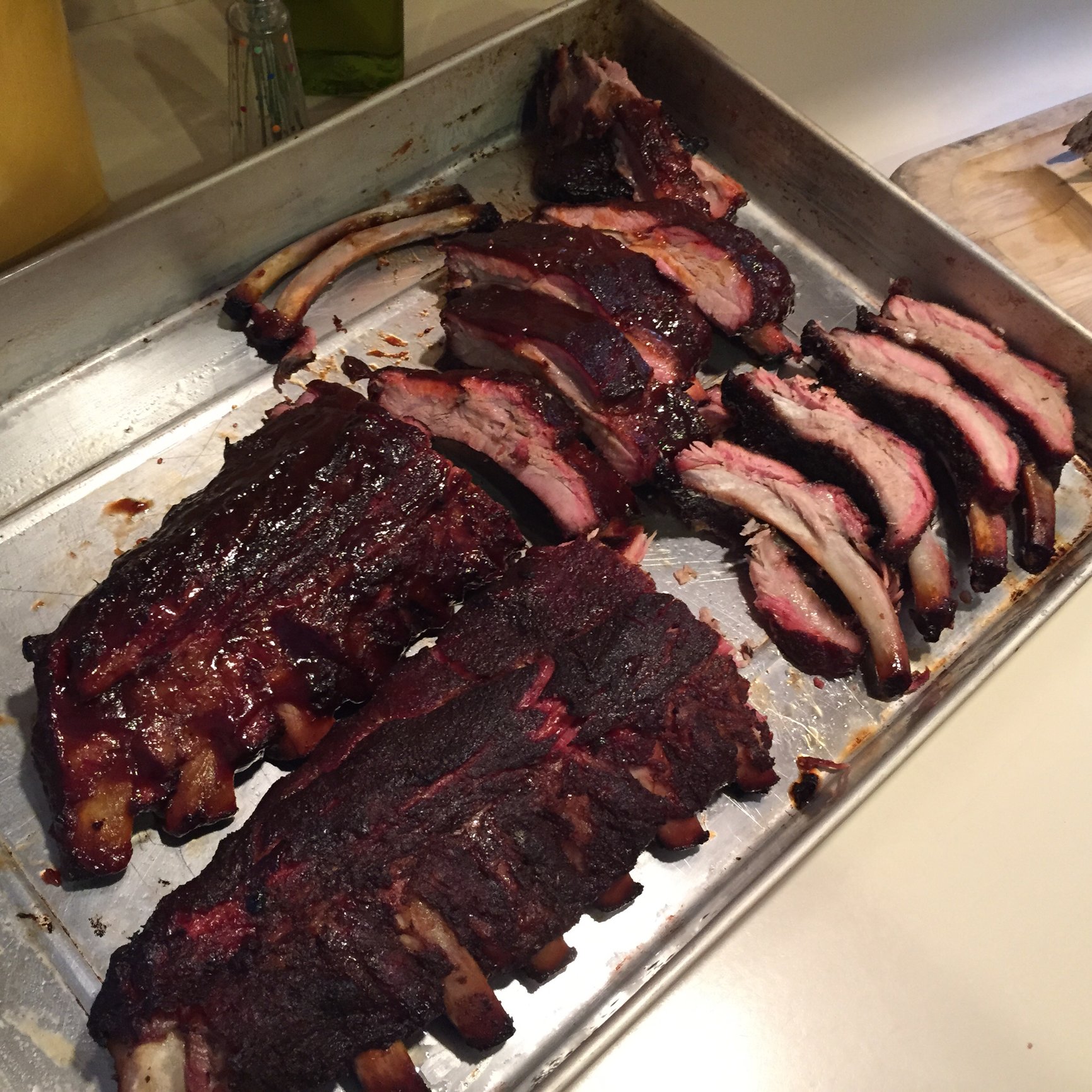 Here is the end result, left out of the refrigerator at room temp for 3 hours then put on a 350 indirect dome one slab sauced on the left and one without on the right for 50/60 minutes,