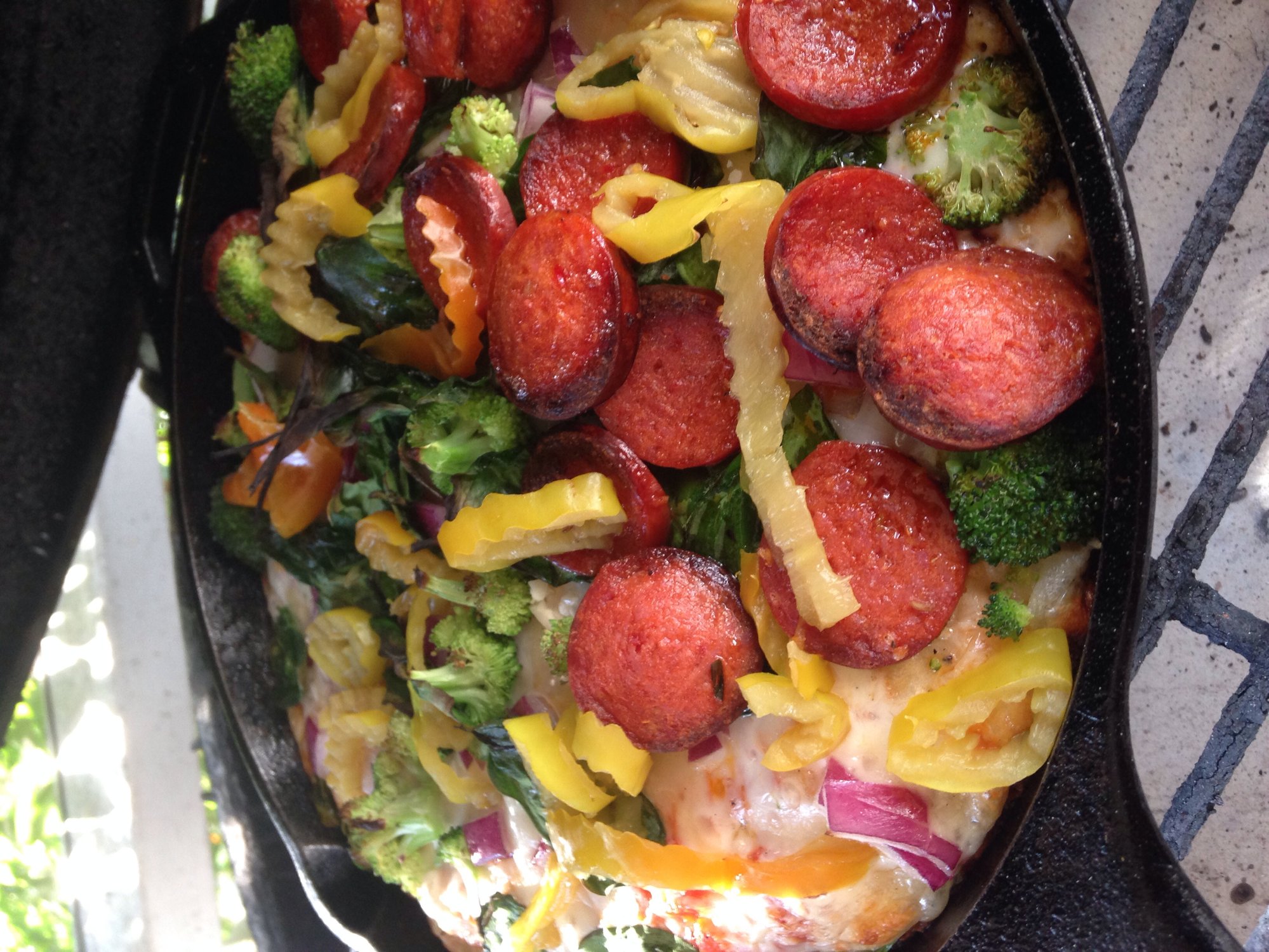 Wife delivered a baby a week ago.Wanted pizza so I stuck my chest out and fired up the egg. Opened pantry-- no instant yeast. So off to grocery store for dough balls. Made deep dish veggie add thick cut pepperoni and a cheese pizza for my 3 year old