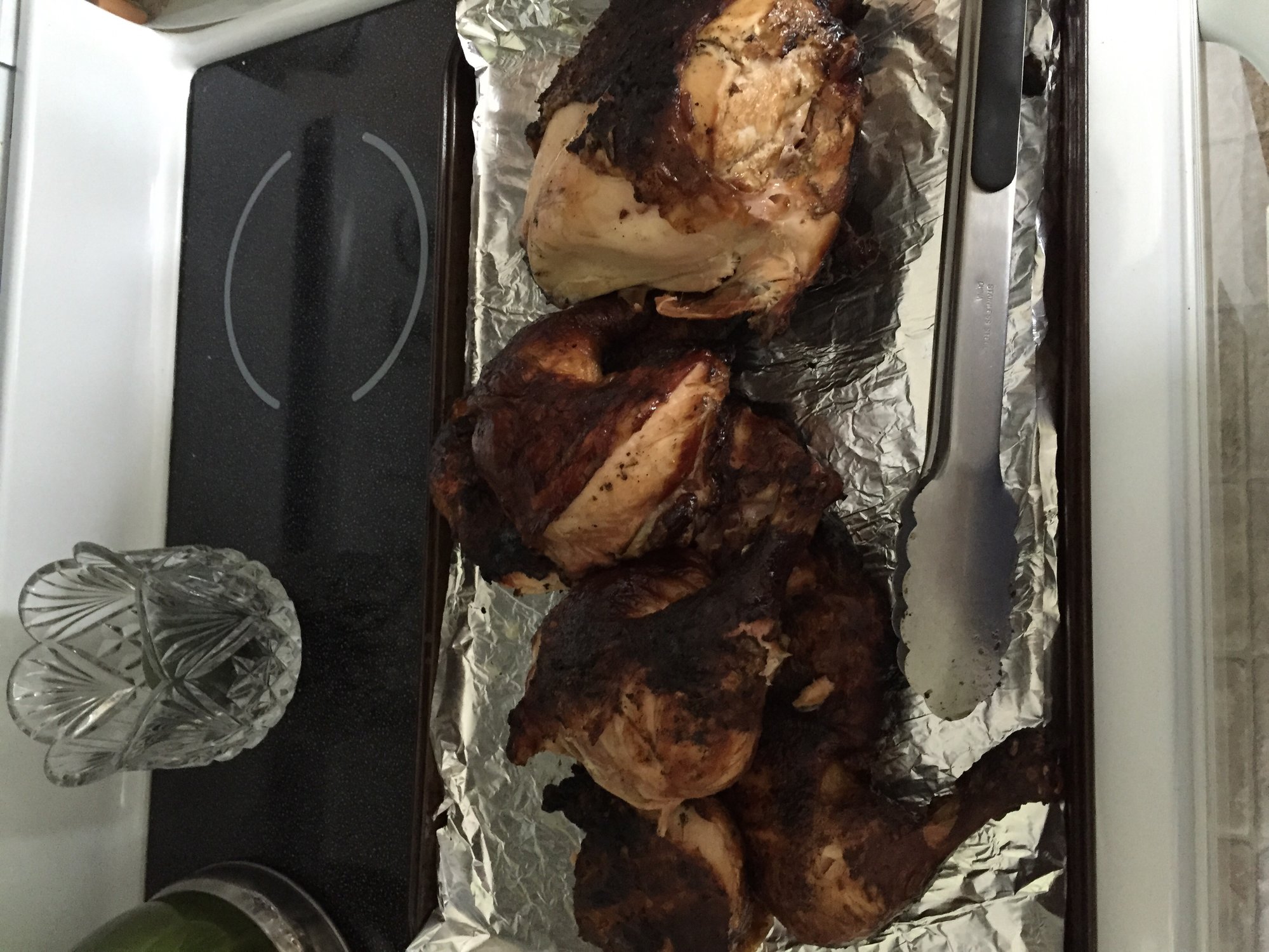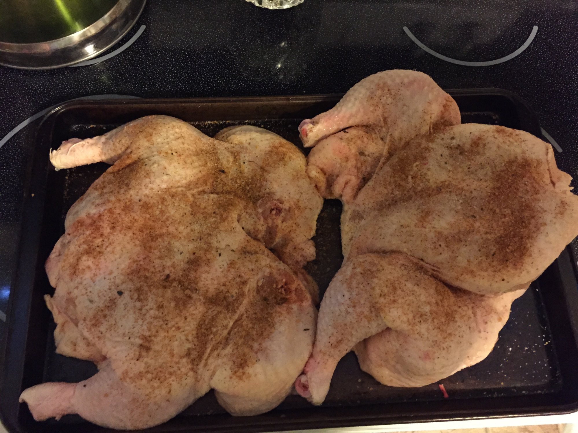 since I had a bit of the Irish flu yesterday morning, no beer for me. I had rubbed the chickens with what I could find on Friday night, during my path to destruction. Chicken came out delicious! I threw on a few apple chips. Rookie mistake #2: forgetting to clear out ash. I couldn't get hot temps, so I ran at 350 for everything. The only casualty were a few potatoes that took too much heat. Not a bad second cook. I even made homemade BBQ sauce.