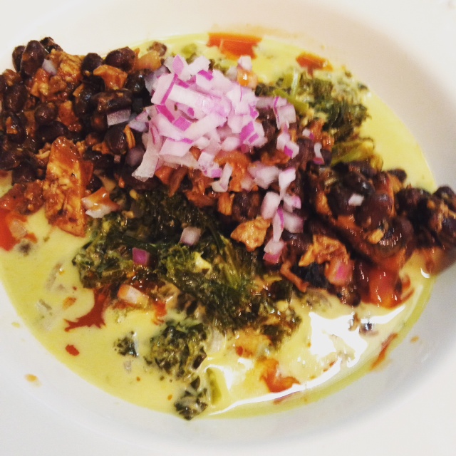 Took my leftover smoked chicken from Sunday, put in a pan with onion, black beans, ketchup, hot sauce and homemade mustard based BBQ sauce and served over some cheddar cheese creamed kale I made. Great layers of flavor in the dish...smoke is an amazing thing!