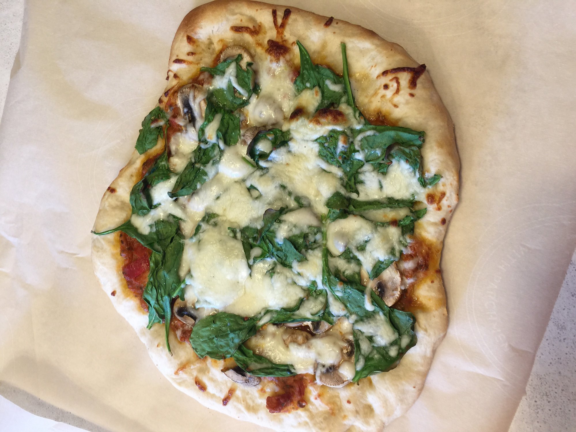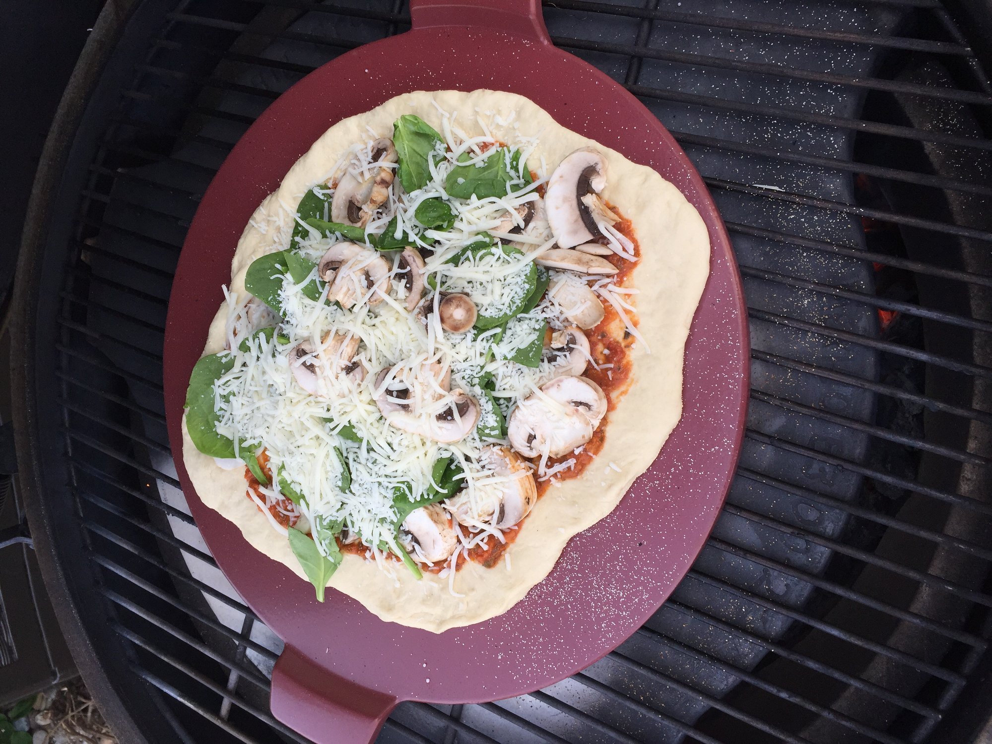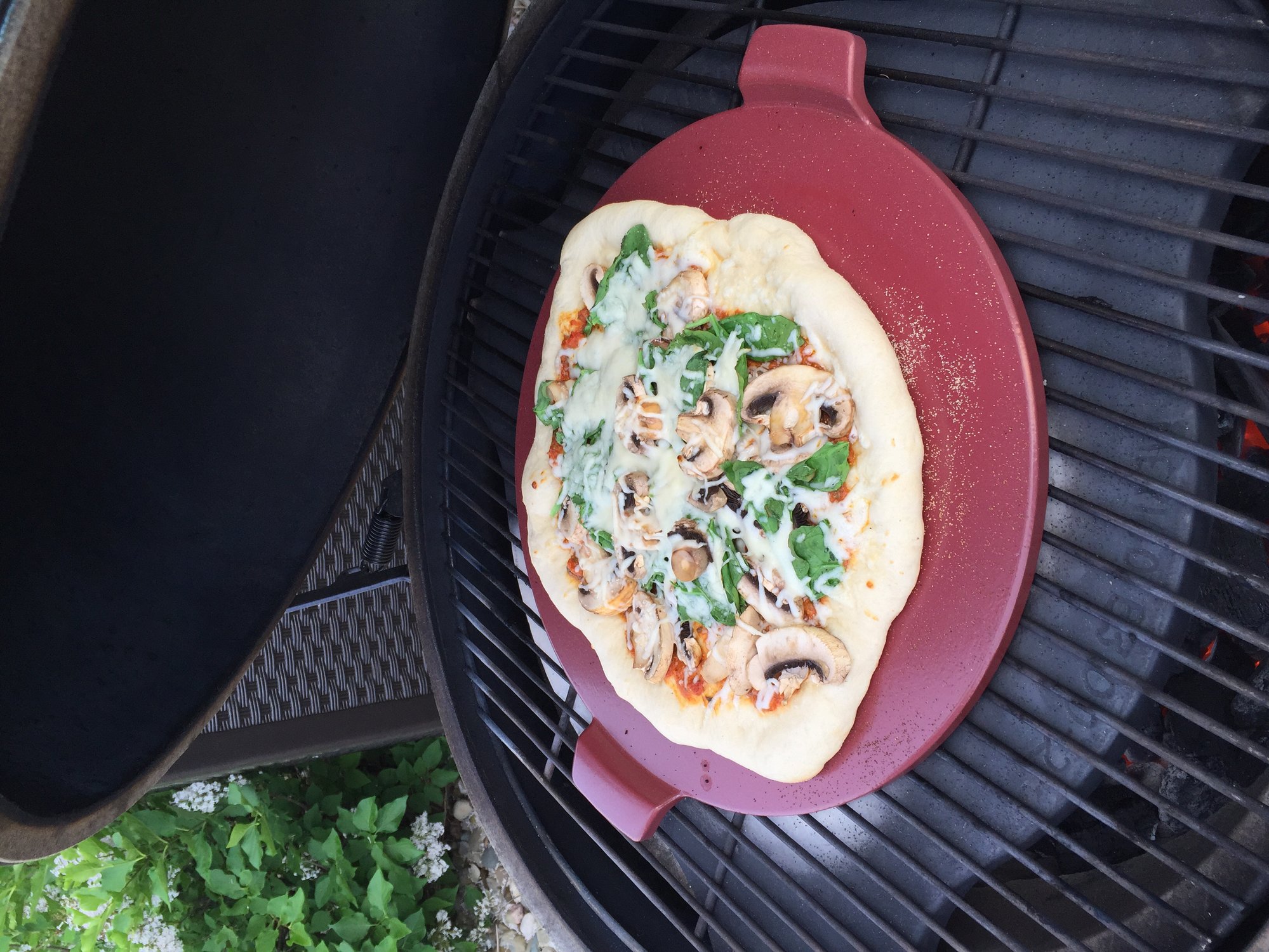 well my wife picked up a new stone, it's glazed, for $15 at world market. So we thought let's give it a try. Heated the XL up to 650 let it sit for 30 min to get the stone nice and hot. Wife put together a simple pizza dough and topped them with a tomato pesto, fresh baby Bella's, Mozzarella and Spinach