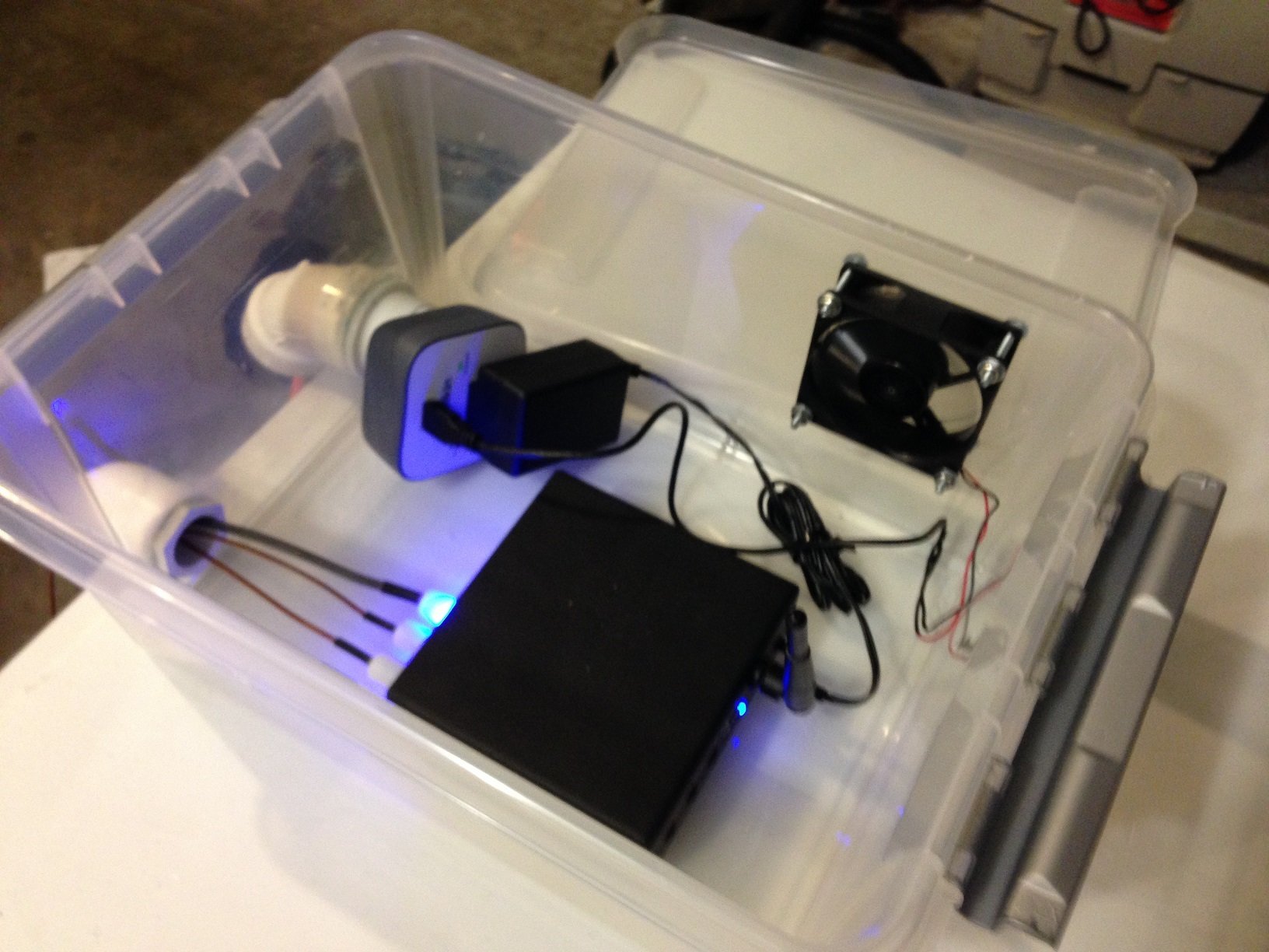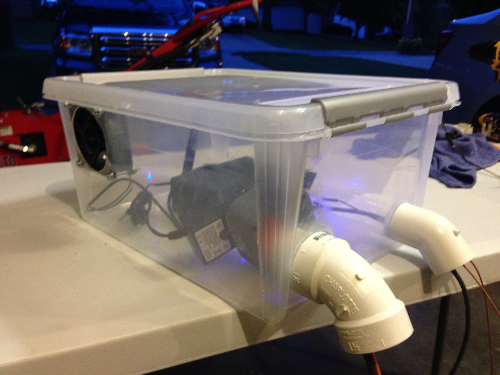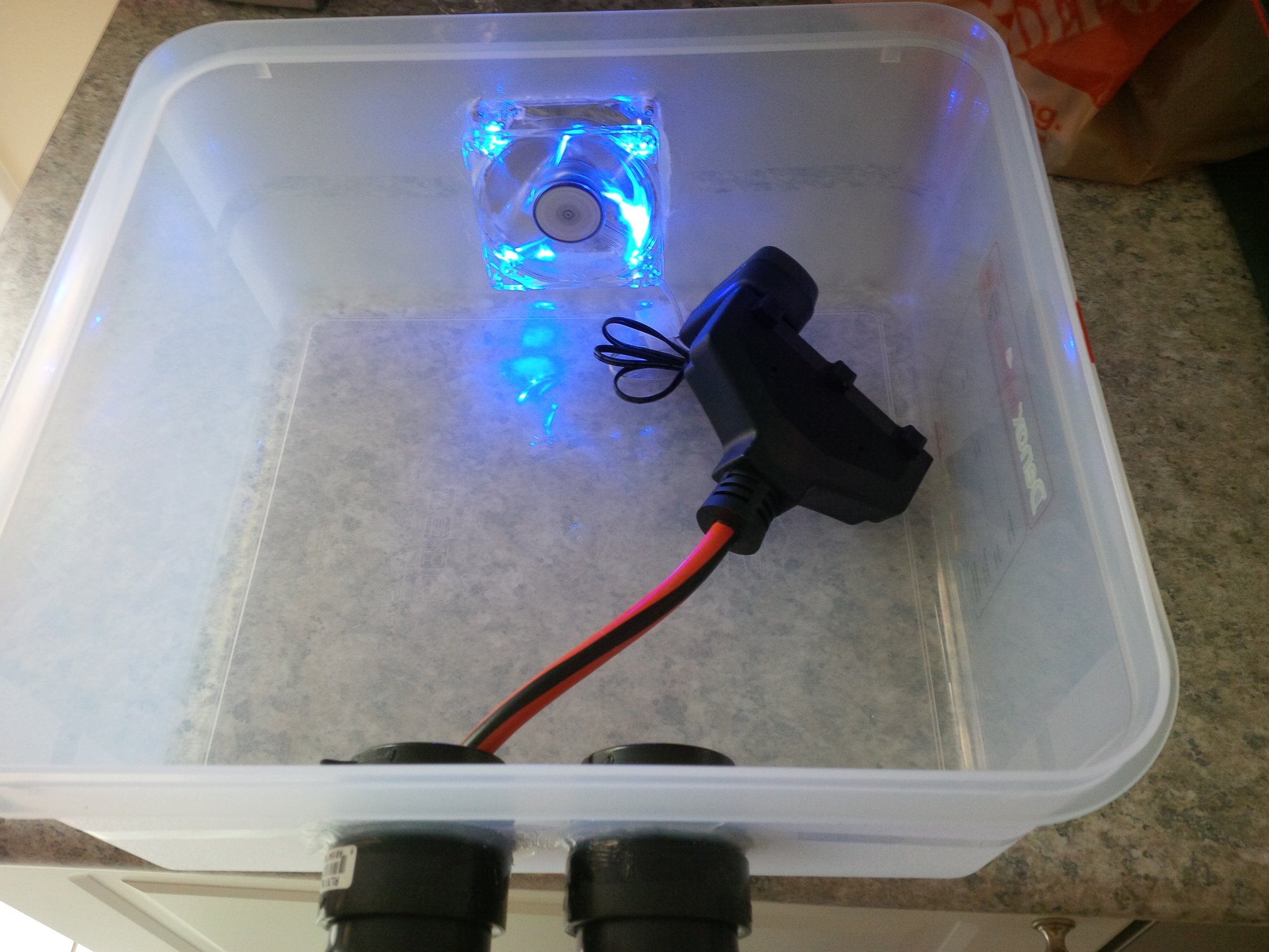 Thanks @Jeepster47 . In terms of the direction of the fan, I'm pushing air out. BUT - I'm technically also pulling air in through the conduits. The cover (15"x13") is a standard tupperware cover that came with the container. It's decent because it doesn't have many pockets where water can collect, thus most water should drain off easily. It however is white, but I figure I can see through the side of the clear container. No clue how long the 9V battery will last - I suppose I'll find out soon enough! Didn't even realize computer fans were rated by CFM's, so I'm not sure how many CFM's this one is. It's 8cm, so fairly small and wouldn't provide much in the way of CFM's (maybe 1 or 2 CFM;s?). I siliconed the fittings in place and also around the perimeter of the fan. Thanks for the velcro tip - I figure I'll wait to get the stoker to finalize positioning, then lock it down with some velcro at that point. I'll also need to find a way to angle the unit up slightly.