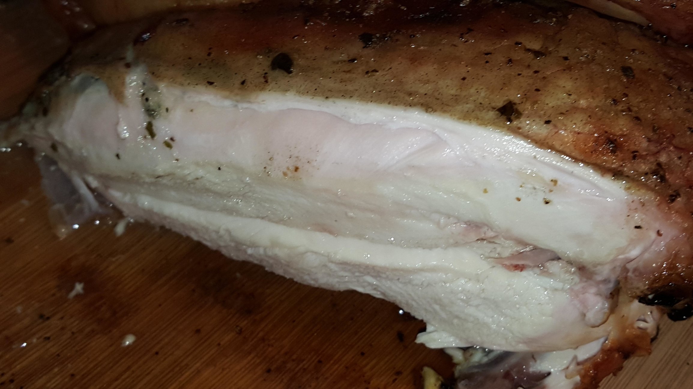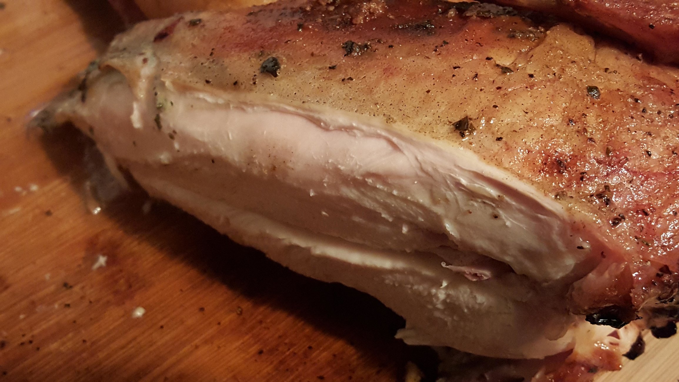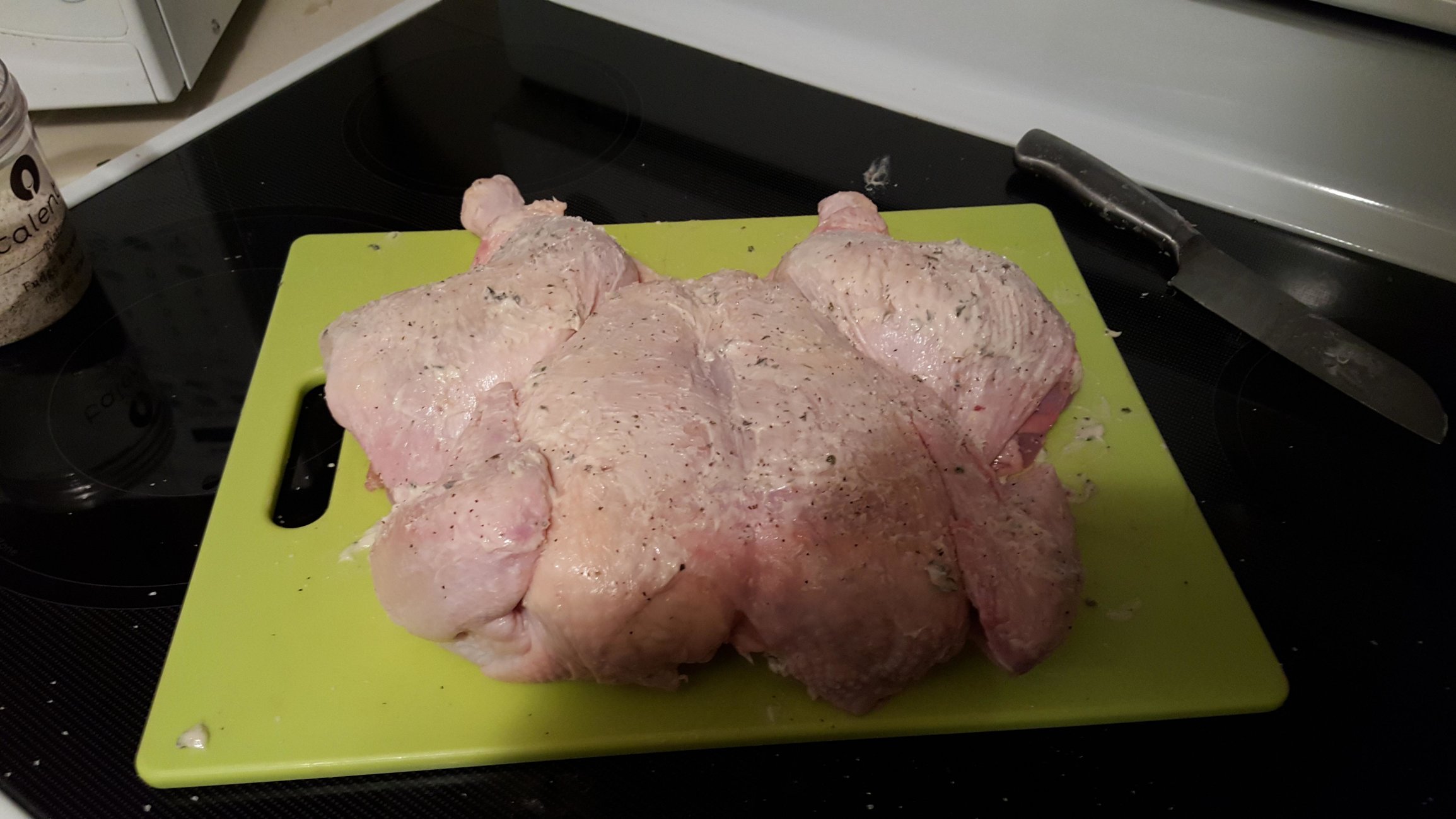 Chicken was covered and stuffed (under the skin) with a lemon/garlic/herb butter. Skin of chicken lightly sprinkled with my own personal mixture of kosher salt/cracked black pepper/garlic powder. Potatoes were halved and, along with the green beans, tossed in a little olive oil and also sprinkled with the mixture.