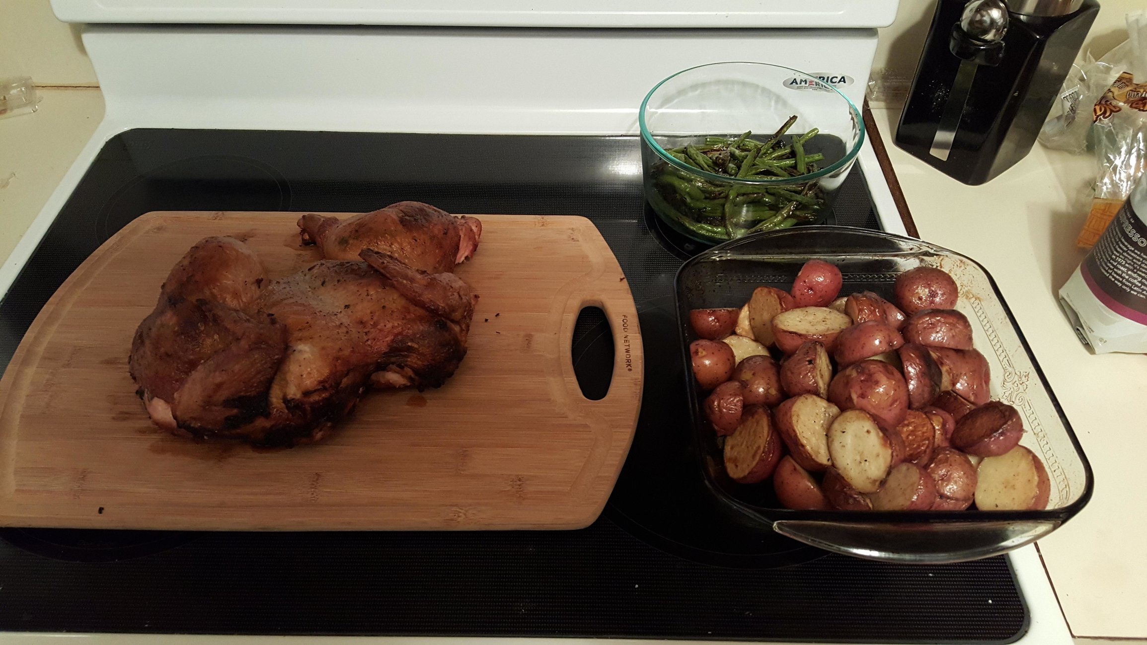 Spatchcock chicken, petite red potatoes and green beans.