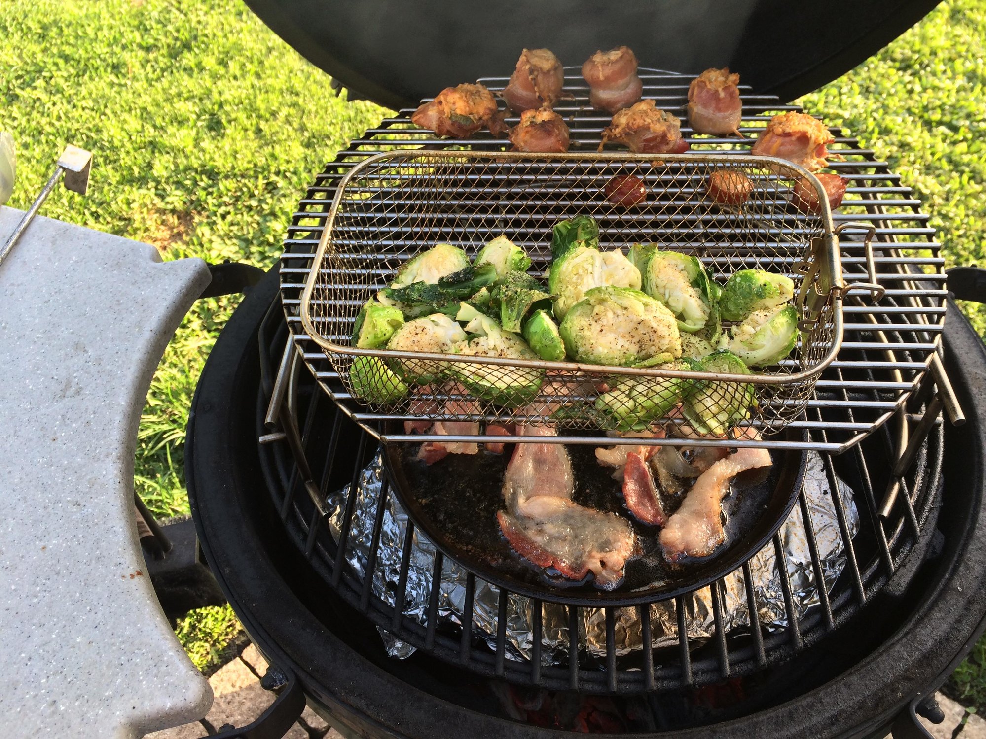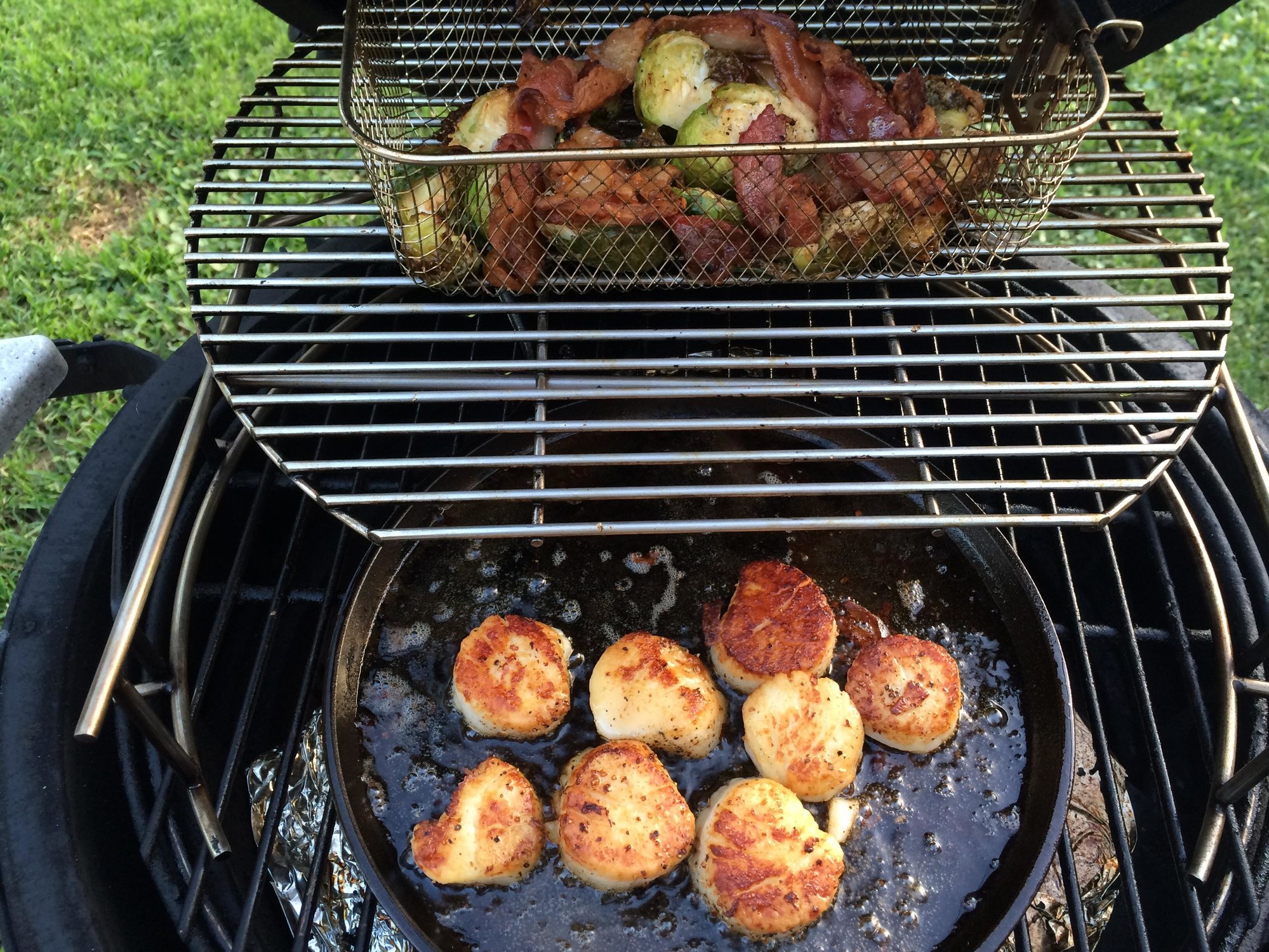 Pretty good for first try. Did some pigshots first so had some bacon and sausage out that worked out good. Cut the spouts in half and drizzled EVOO on and then cracked pepper and sea salt. Had the CI griddle on while cooking the pigshots getting hot indirect over a load of RW about 425.  Drank beer and cooked the pig shots, it was rough but I got through it. Then put some bacon on the griddle and the sprouts in a basket. When the bacon started to crisp I pulled it off the griddle and put it on the sprouts in the basket. Scallops went on the griddle with more cracked pepper and sea salt. So theyre searing in bacon fat....