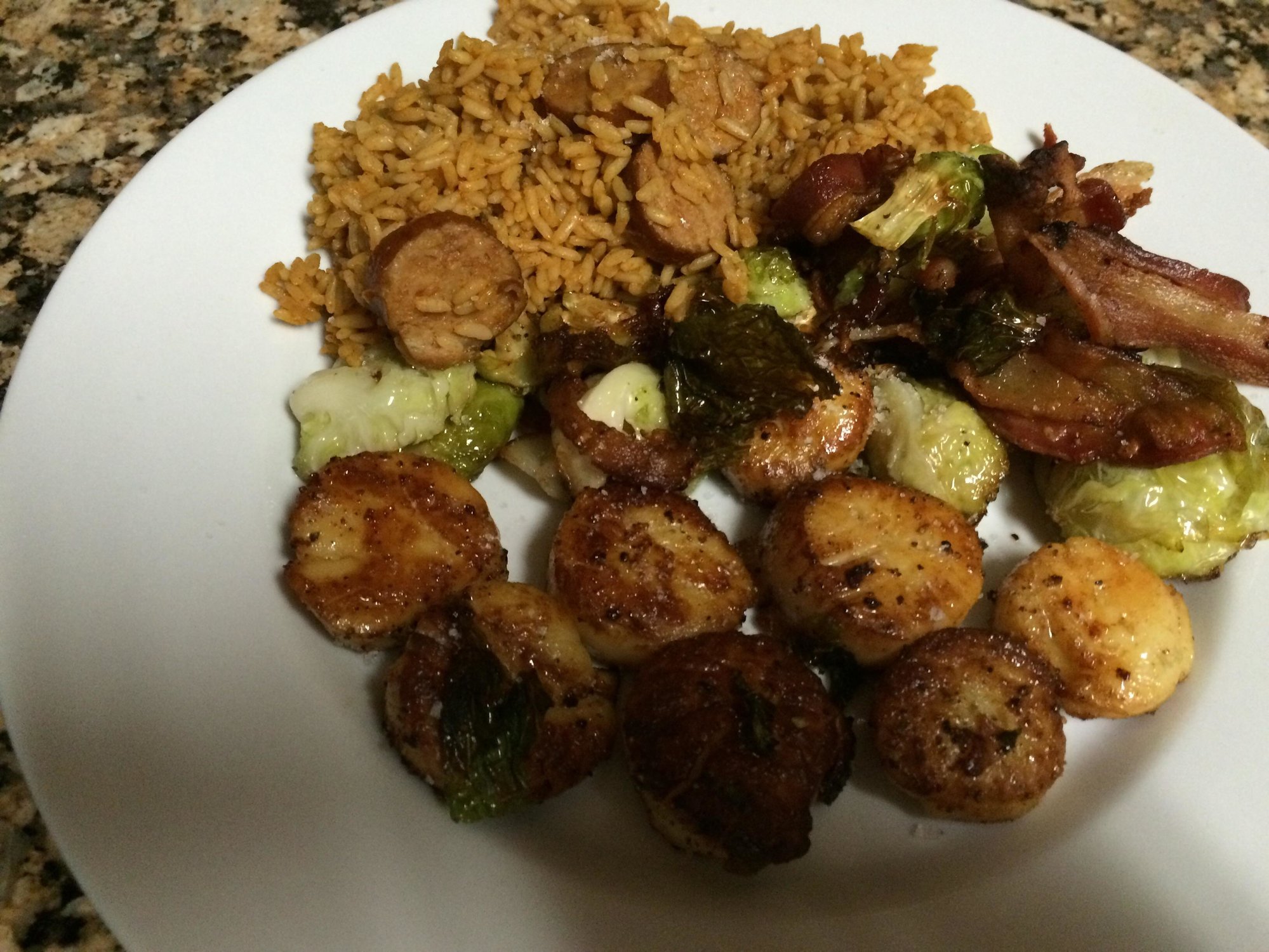 Definitely CI on the scallops with a lite S&P. The sprouts with Vidalia onions (in season everywhere) minced, lite balsamic reduction and cooked till nice and tender.
