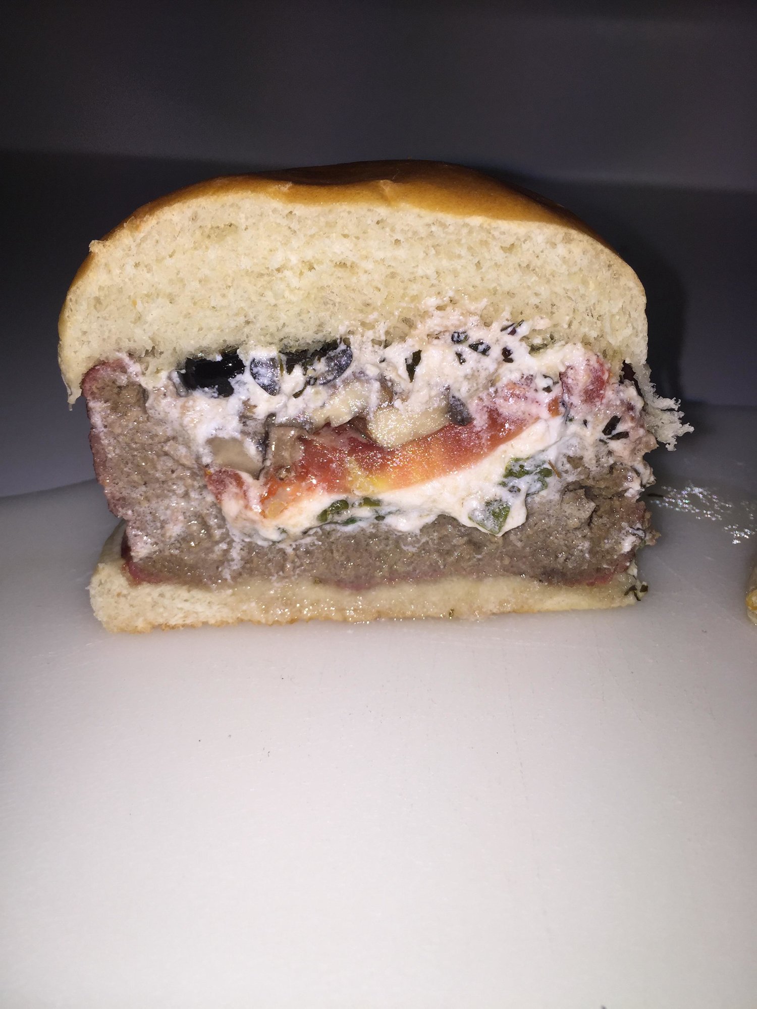 The second burger I used spinach, Baby Bellas, tomato, basil, sliced black olive and goat cheese. 300 degrees indirect with same results.