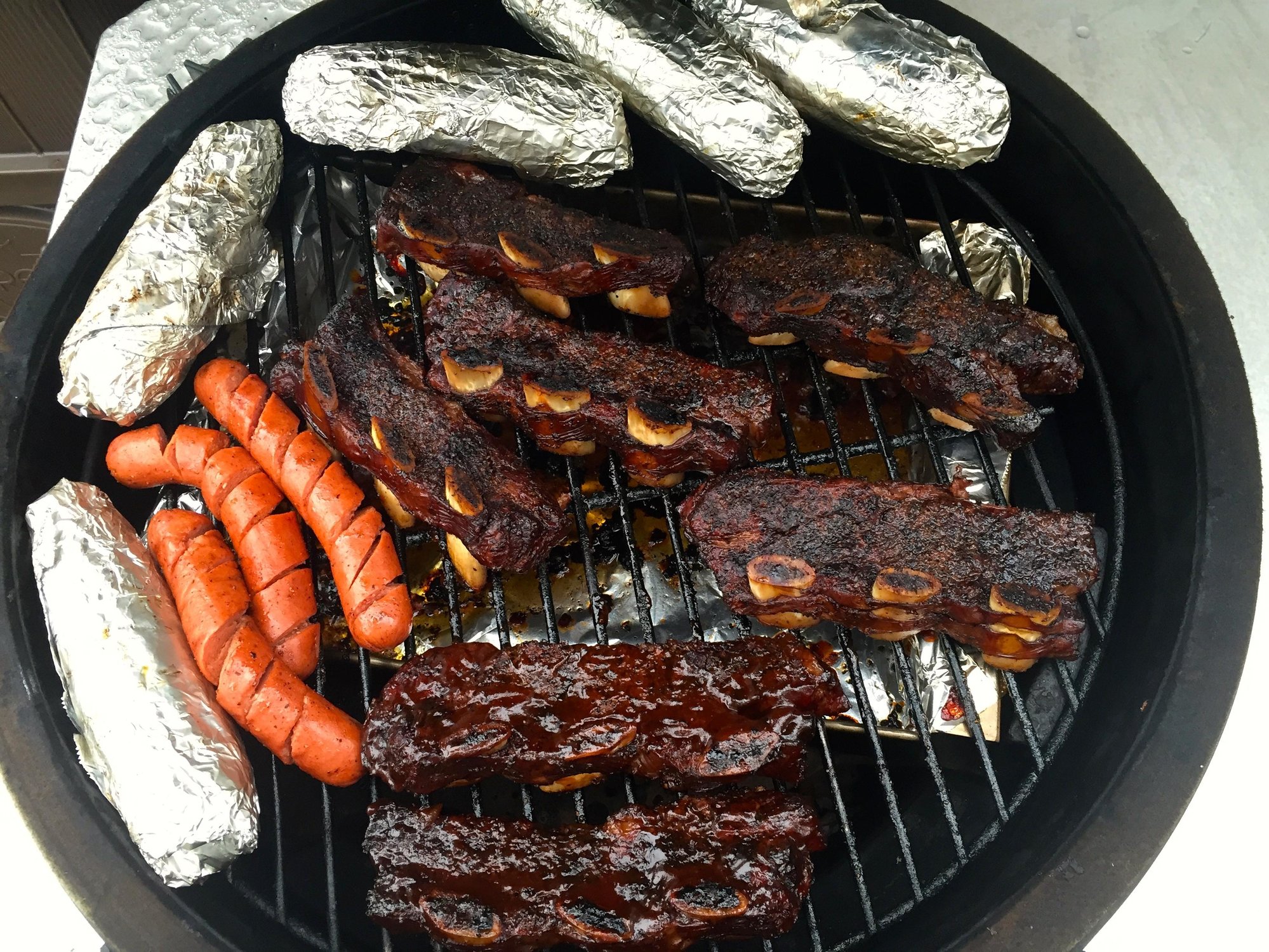 Smoked Beef short ribs, corn, spiral dogs for fun, roasted baby potatoes (in oven, need a second EGG!!) and Quinoa salad.