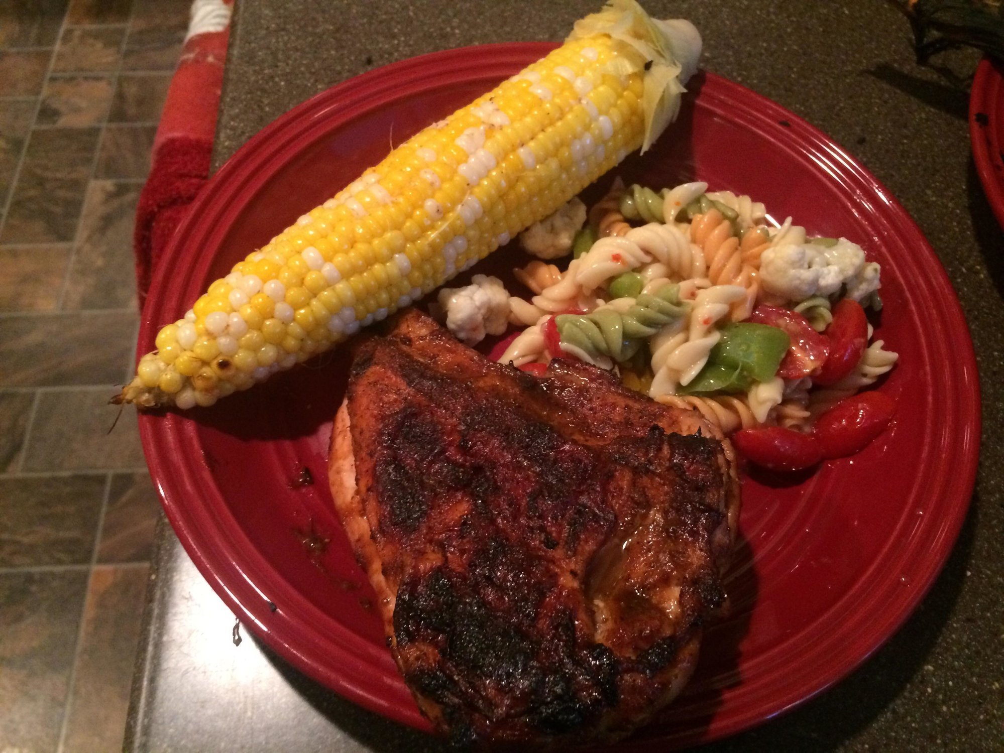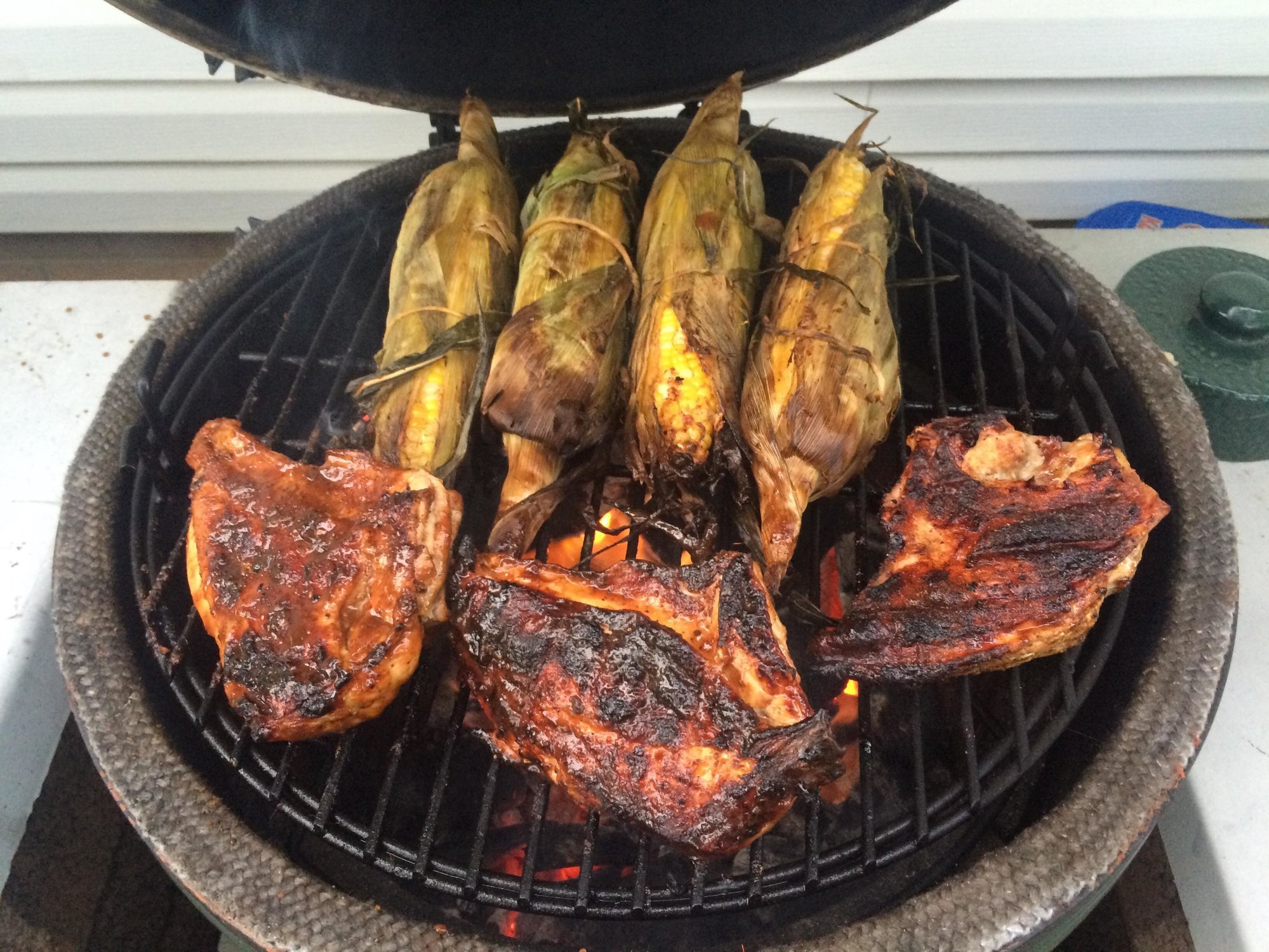 Split chicken breast brined for 10 hours grilled to 160IT and two of the pieces had BBQ sauce added.   Corn was peeled back and a butter mix was added and then the corn was tied back up.  Butter mixture had butter, garlic, paprika, and chili powder added to it.   By far the moistest and most flavorful chicken I have made to date.