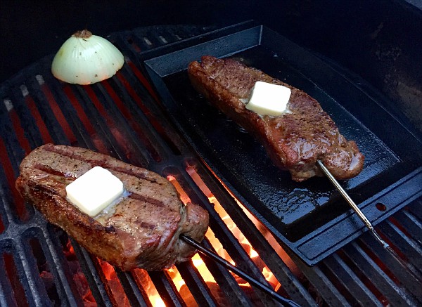 I decided to do one on the grates (S&P) and one on the cast iron (steak seasoning). I buttered after the first flip and when I removed it.