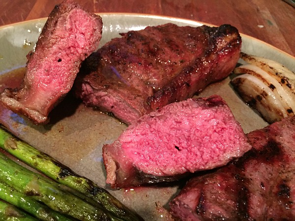 Anyway, the organics looked like nice cuts, so off I went.I wasn’t varying from the technique talked about here in the past. I was going for 115 IT indirect at 250, remove the plate setter and crank the heat to 500ish, and then sear for 60-90 seconds per side. I like a MR steak…or <gasp> sometimes a little medium. Let’s see how I do…