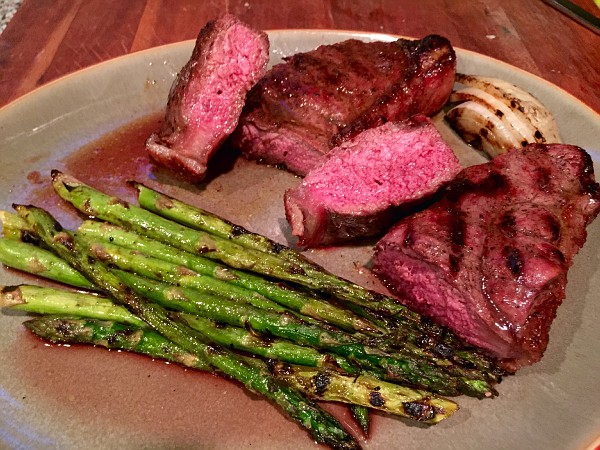 Those are beautiful steaks! And asparagus is just made for the grill. Top notch.Always seeking the high I experienced from my first true BBQ experience.