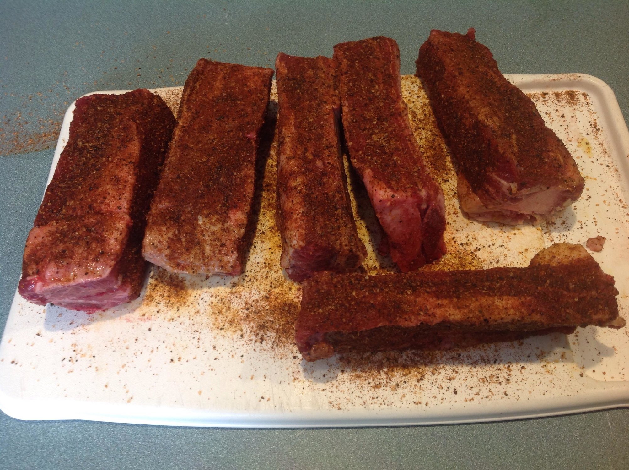 Picked up some individual short ribs, rubbed them down with EVOO and DP Cowlick. The Egg is heating up to 250 F with two chunks of hickory and a single small chunk of mesquite. They should could faster being singles I would think?