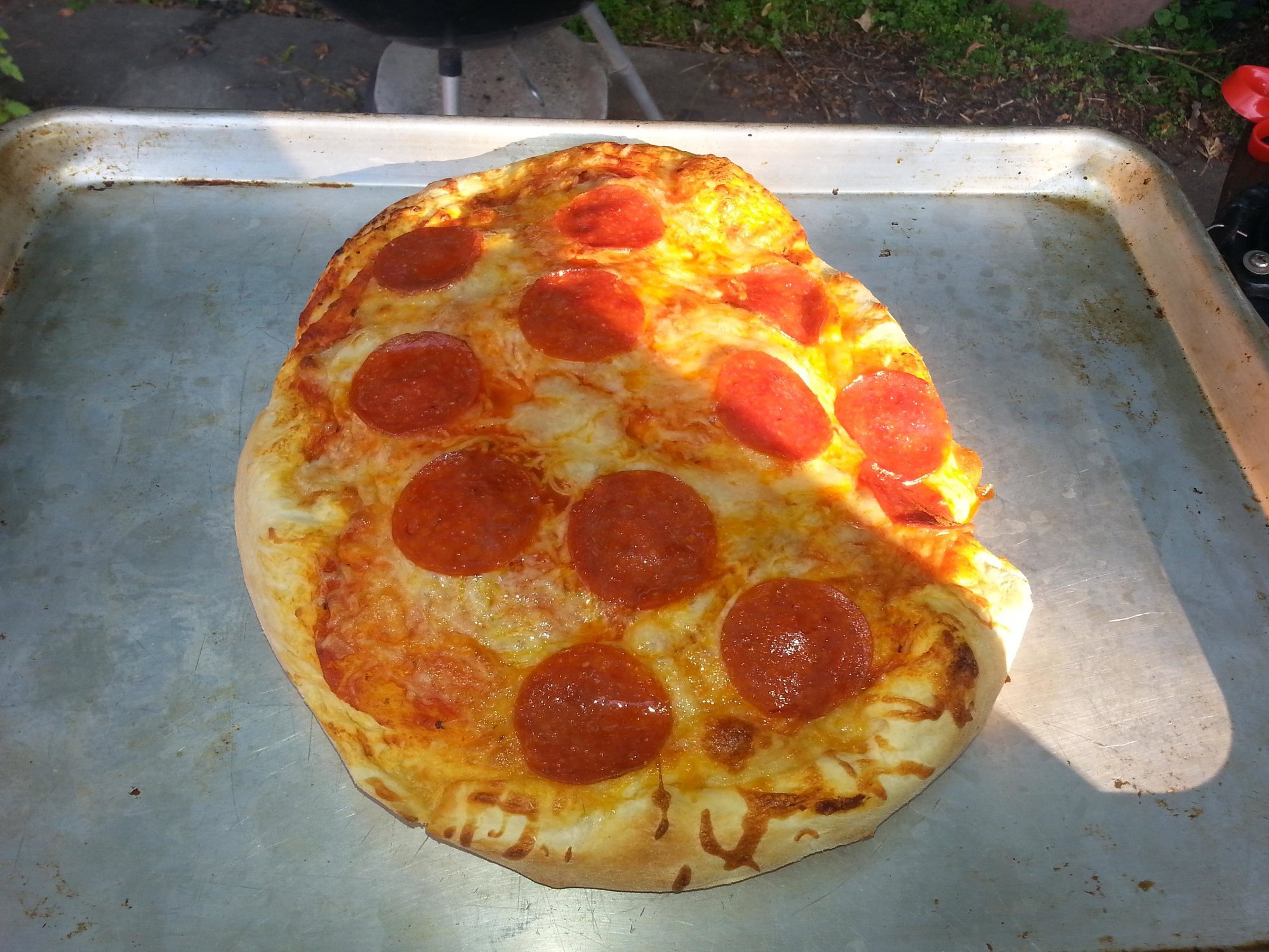 Tried my hand at pizza tonight.  Used a store bought frozen dough (Rhodes, I think).  Being the 2nd time handling pizza dough I have much to learn it seems.  First 2 pizzas were really thick.  The 3rd one was getting there.