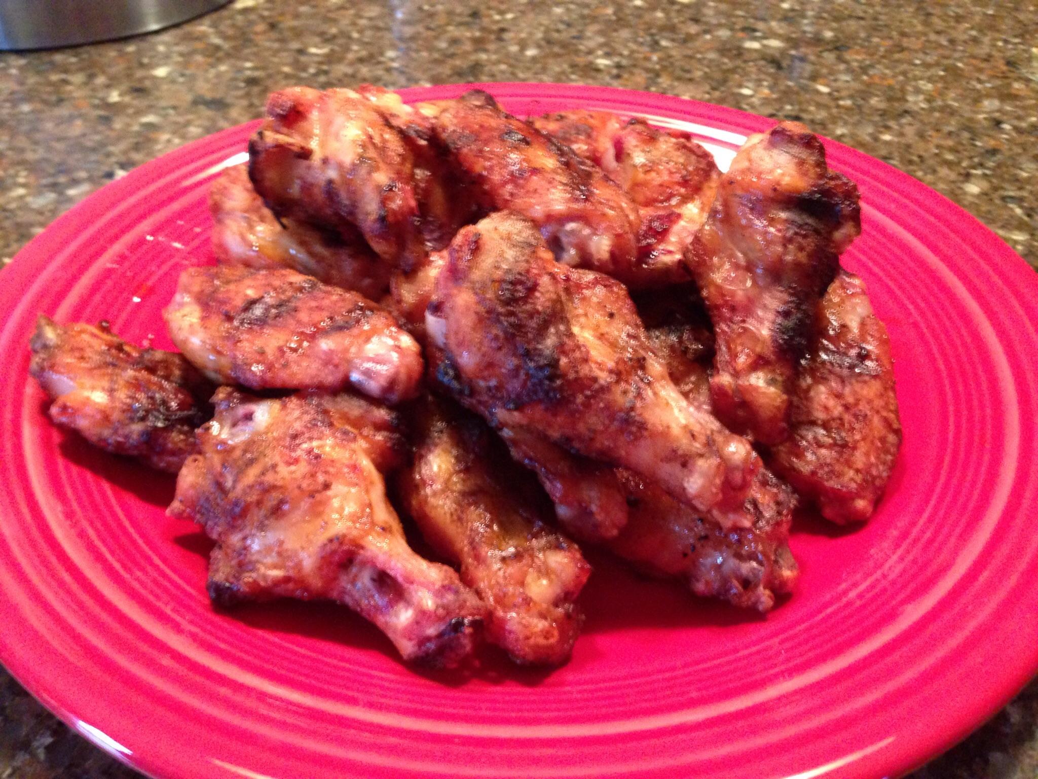 Wanted to try doing some wings indirect like I've seen some people doing here lately. I coated the wings with some corn starch, then half with honey hog and the other half with honey hog hot. Raised indirect at 450.