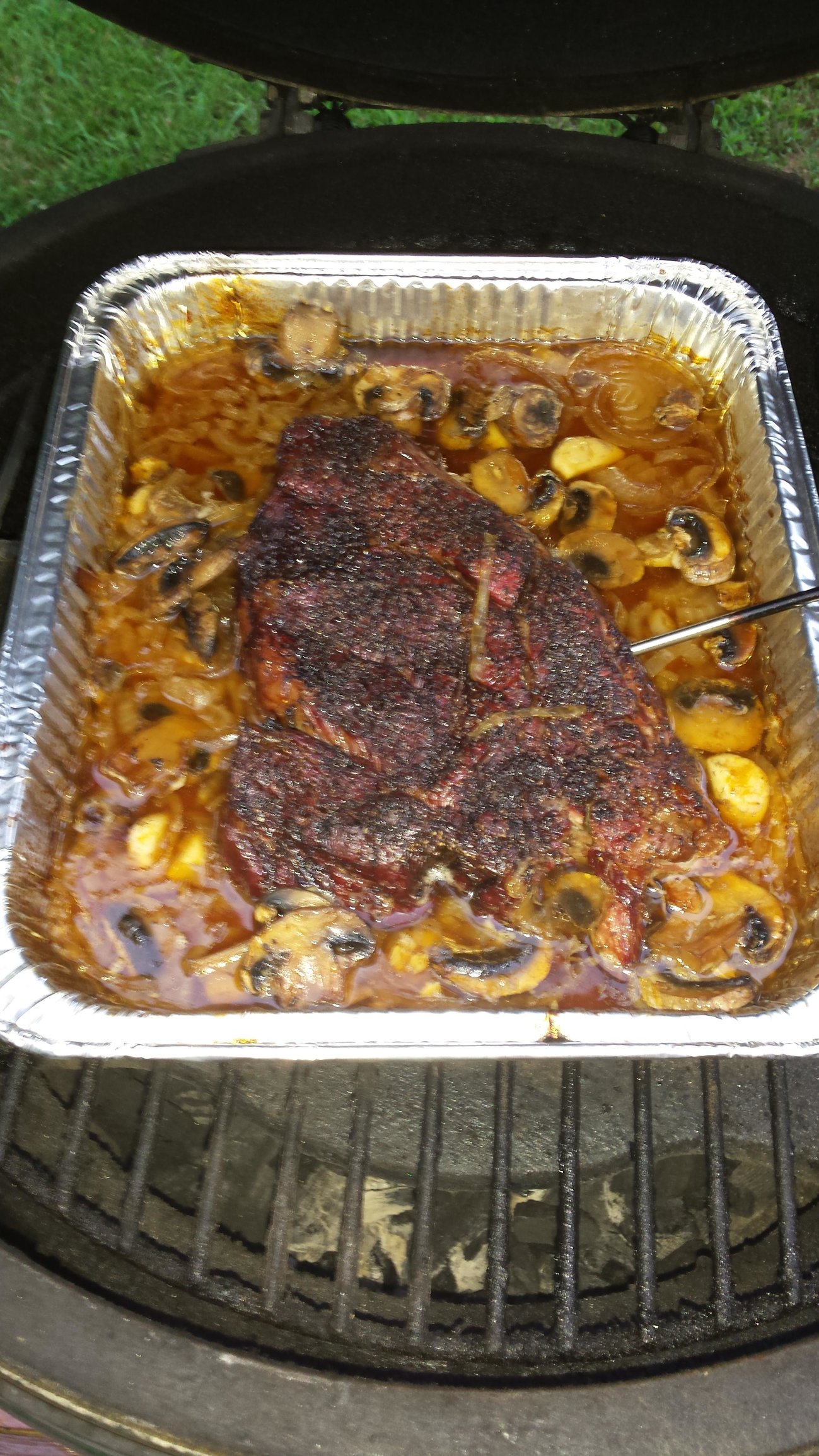 Indirect, 275 for 3.5 hours or until it gets thru the stall. Then put it in foil pan with 2 cups beef broth, 1 onion sliced, mushrooms, and 4 cloves of garlic. Cooked until IT of 210. Salt and pepper only for the roast. Got a nice bark. Took leftovers the next day and warmed with provolone cheese on sourdough bread.