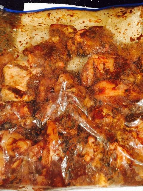 Started with a marinade of Spur Tree Jerk marinade and blended it with scallions, thyme, garlic cloves, thyme & browning sauce. Used 2 Publix Greenwise whole chicken cut into pieces and marinated it in a large ziplock bag and set it in the fridge for 4 hours