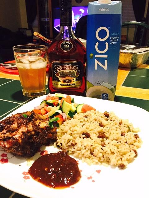 Plated it with rice & peas, tomato cucumber salad & spicy jerk BBQ sauce and washed it down with Appleton Estate 12yr old rum and coconut water .. yum!