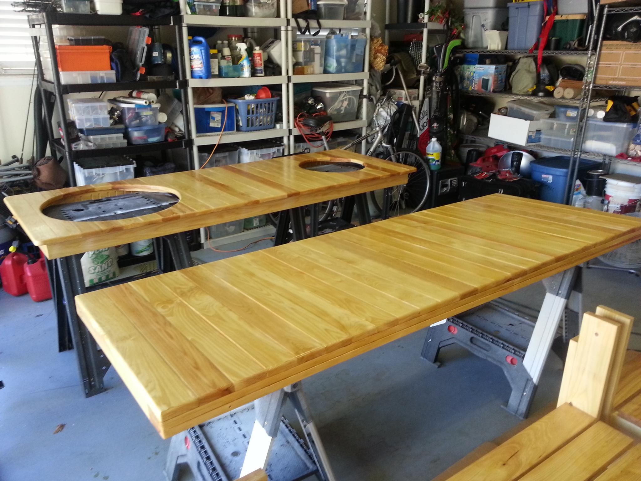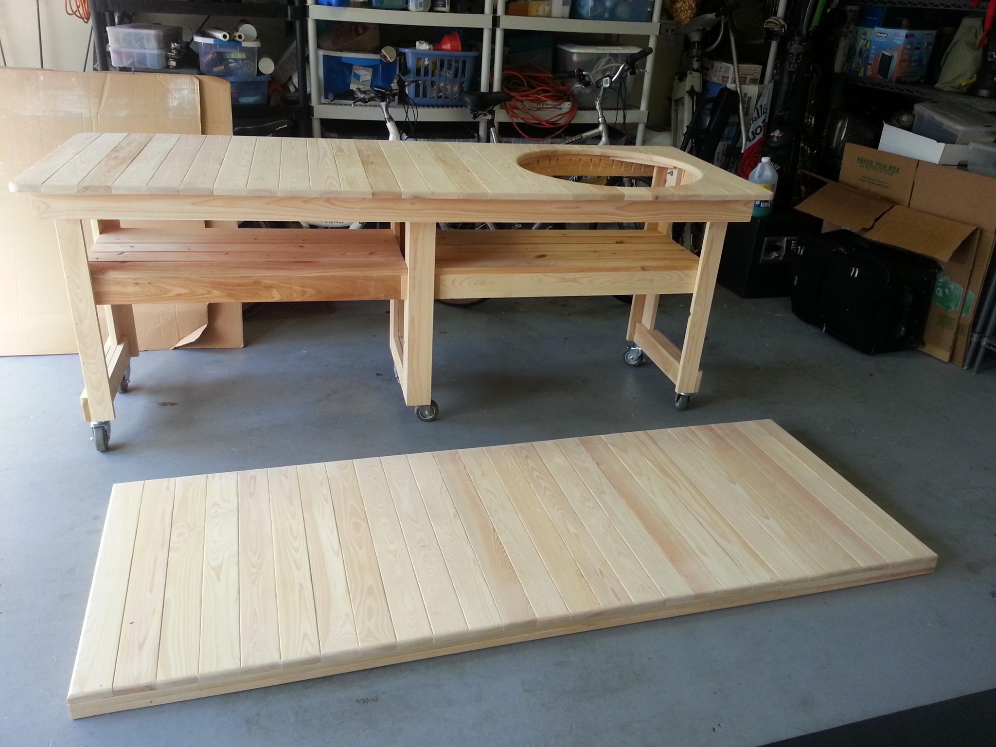 This is my egg table (before I cut the hole for the Med) and the island top before I built the base. All of the wood is Cypress.  I must admit I did not build it.  There is a gentleman in GA that builds about 2-3K tables a year for some of the biggest ceramic cooker companies.  He is about 20 miles from my sister's house so I drove to GA to pick them up. I could not buy the materials for the cost of the tables (it would have been pine not cypress) and then I would have had to build them.  Both tops are 35 inches deep and 90 inches wide. I had them built at 36 inch counter top height. I am building a custom base for the island top with storage and a overhang on three sides for bar stools.