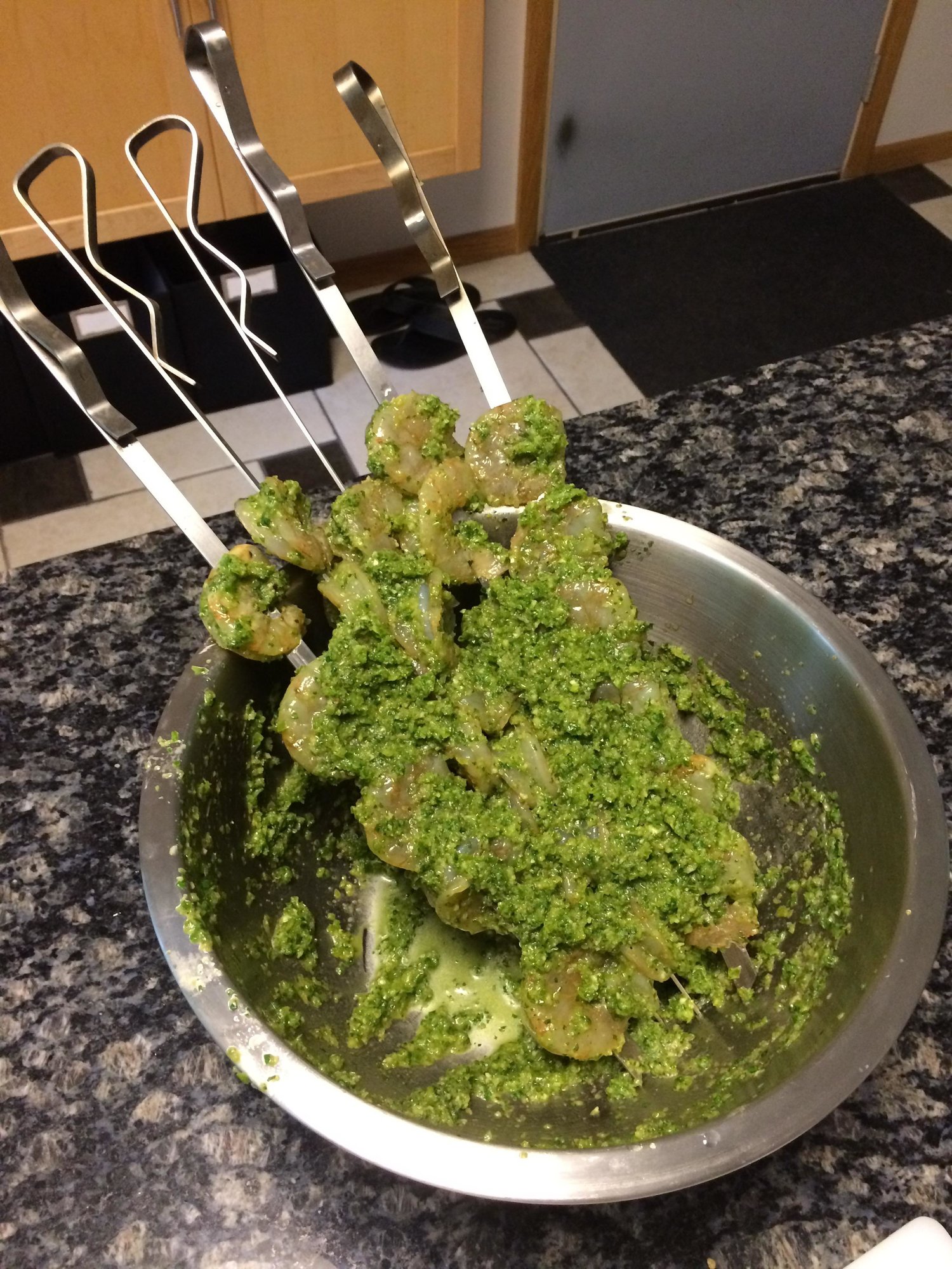 I've been wanting to do this for a really long time and we finally had the chance to give it a go. Shrimp were previously frozen, but that's kind of what you get here in the midwest (unless you have SERIOUS bank to shell out...). I cooked at 500 for about 4 min total; raised, direct.