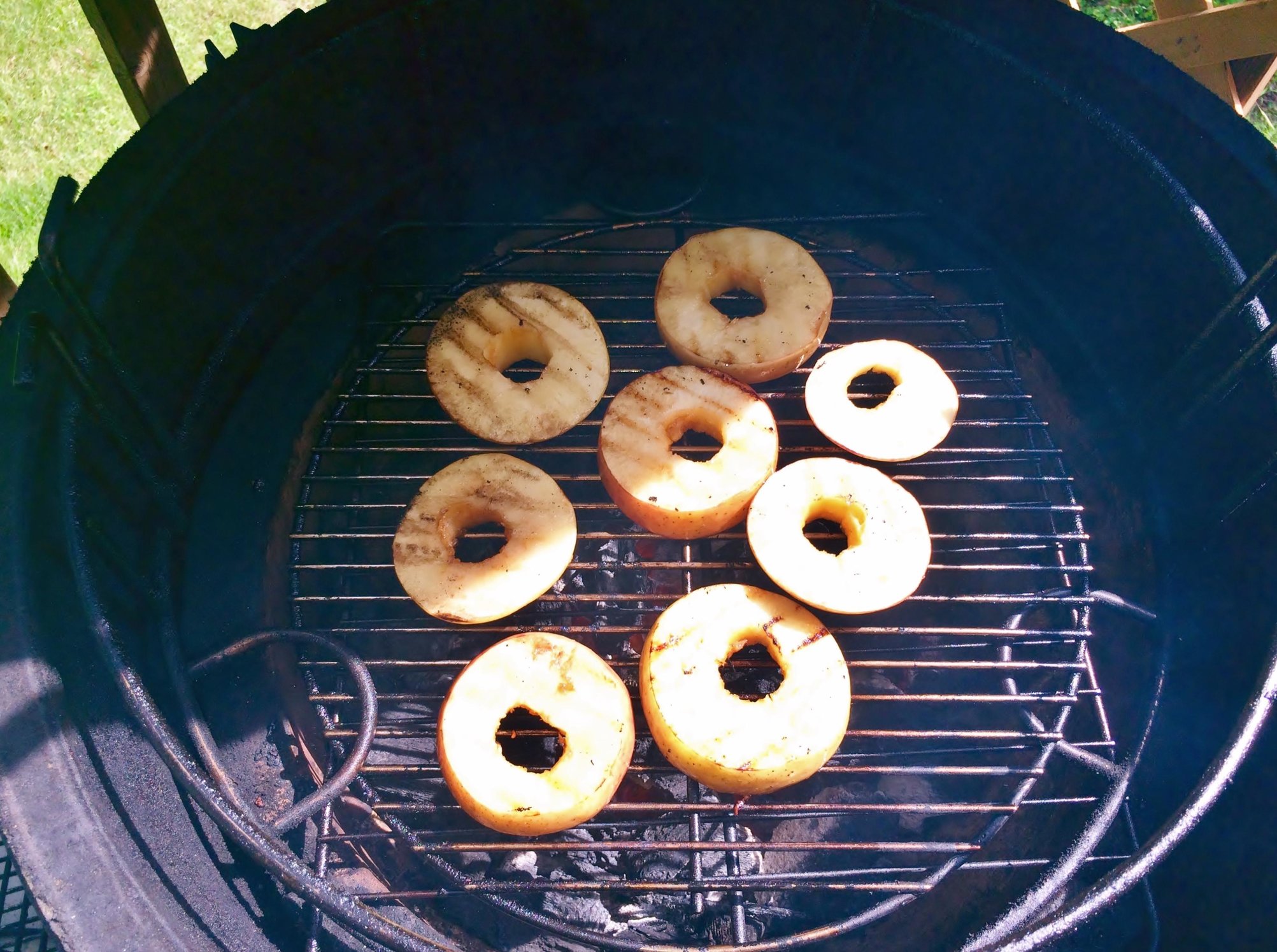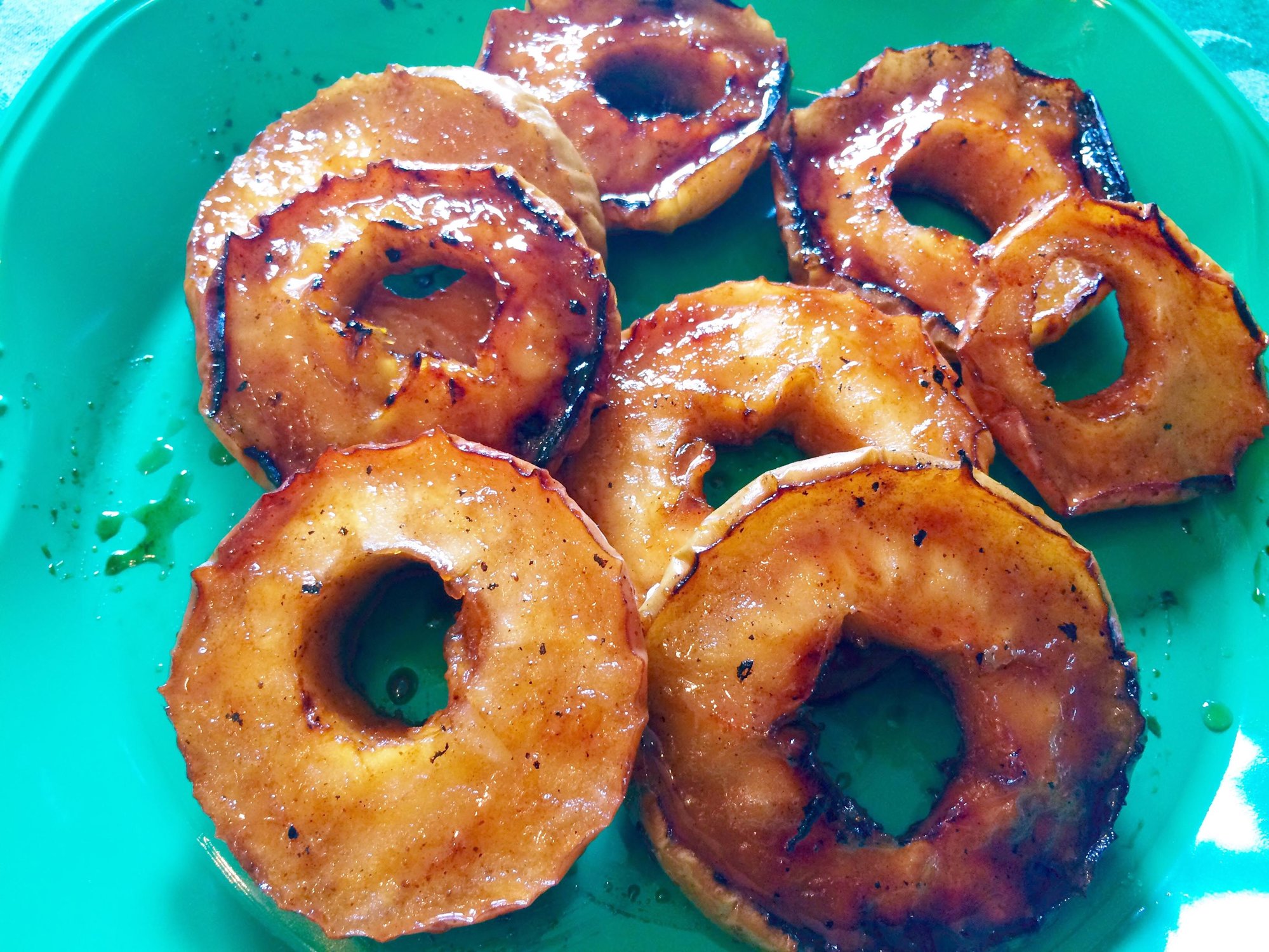 Vanilla ice cream awaits these two sliced Fuji apples which were grilled and then