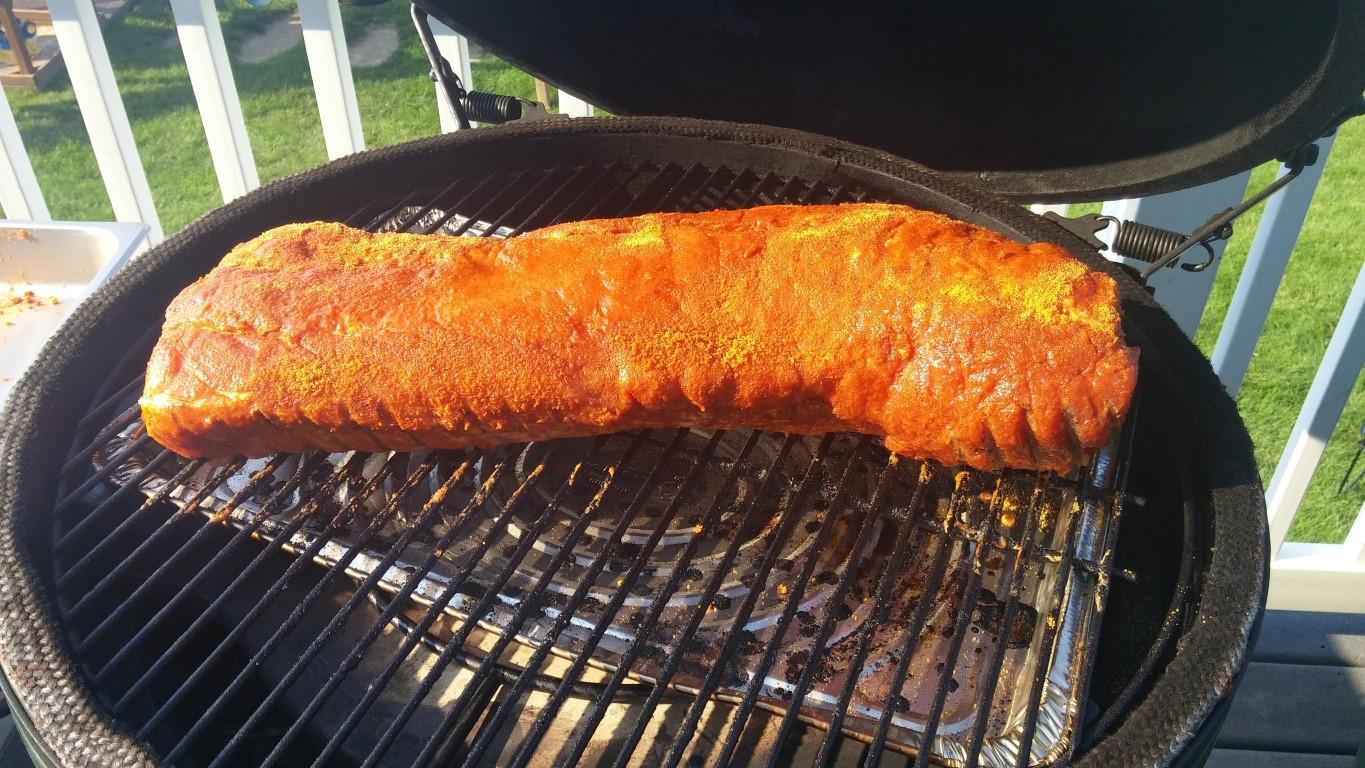This morning it wasn't completely thawed, but enough so that rub would stick. Whole pork loin is a 1-2 hour cook depending on temps, so I figured I would give myself an extra hour. I wanted to be finished by 11:30, so at 8:30 I tossed it on at 325* indirect with oak and apple wood. It was rubbed with Meadow Creek BBQ rub. If you have this rub, be careful with it, it is very salty. I only use it on large cuts like loin or butt, never use it on ribs.