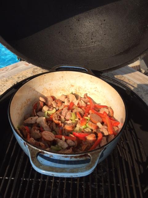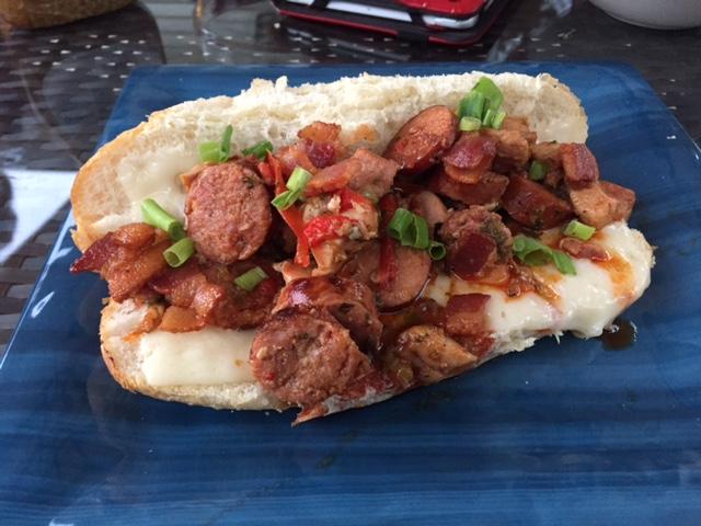 Bacon, chicken thighs, pork butt, andouille and sweet sausage. Onions, peppers, celery, cayenne pepper, garlic and green onions. Bread toasted with havarti cheese.