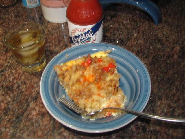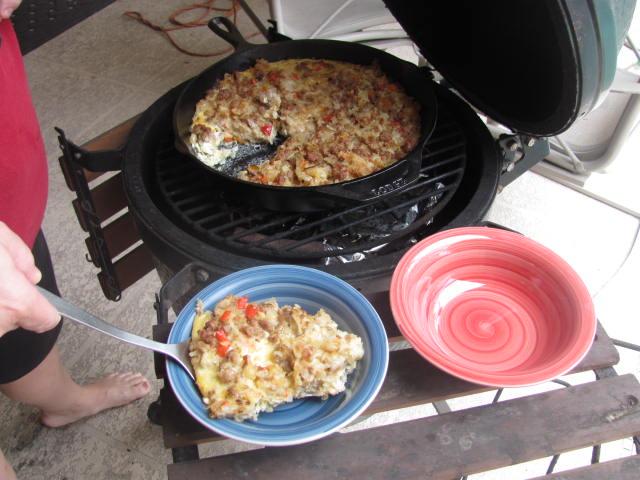 This hash brown and sausage cook was great. I cooked the sausage, onions, peppers, and hash browns the night before and added the cheese.  The eggs were mixed with milk and set in the refrigerator. This morning I got up and fired up the large. I cooked it at 350 for 50 minutes.