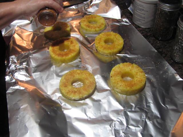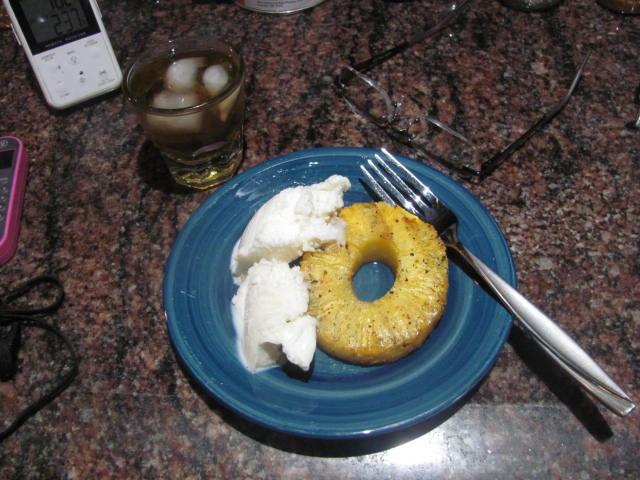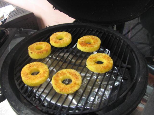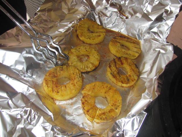 I bought a pineapple yesterday after a trip to the Green Egg dealer. I purchased a bottle of Dizzy Pig Pineapple Head rub. It was a fabulous complement to the pineapple. A couple of our guests also added a little Grand Marnier to theirs.