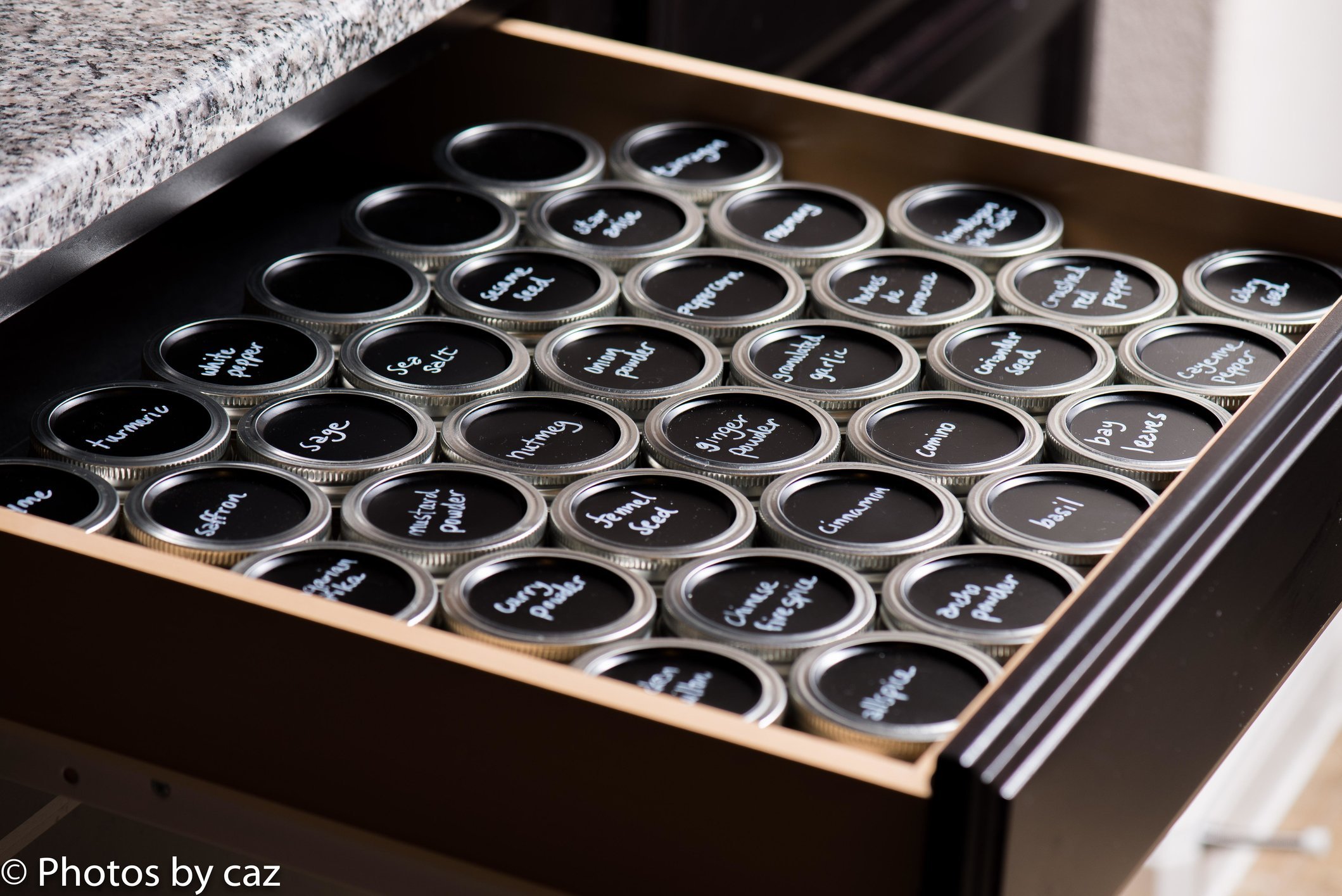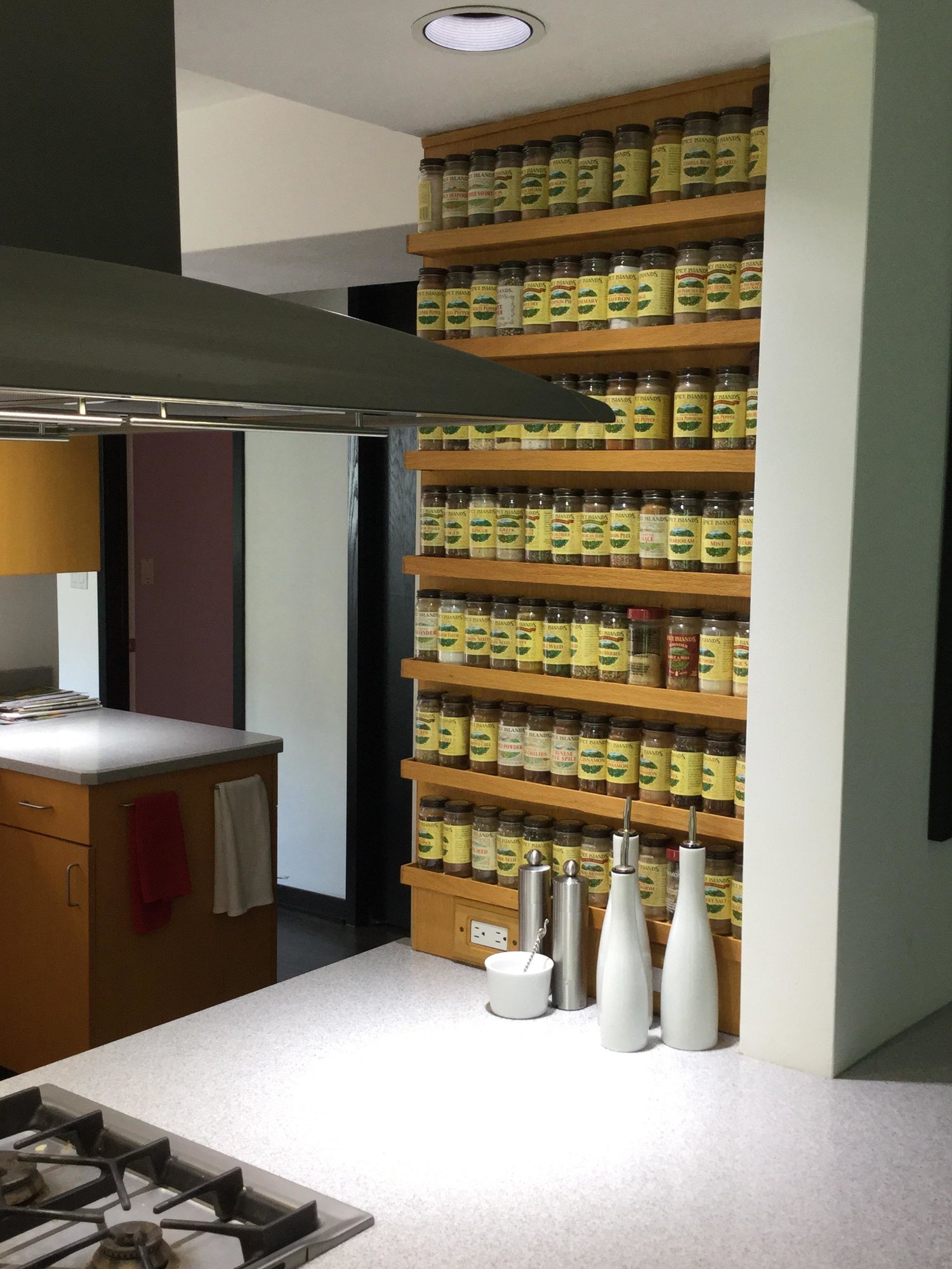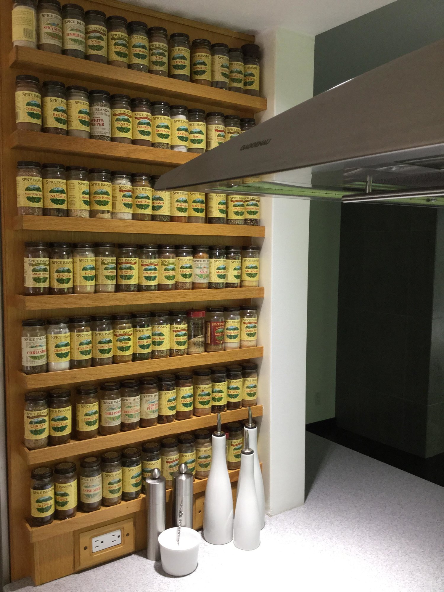 I love the idea of a spice drawer but didn't have available drawer space.  TaDa! The spice wall was created Admittedly, some of the spices are used infrequently but most are replenished within a few months. The only downside I have ever experienced is after parties and a few cocktails my enterprising friends find great humor in reorganizing the alphabetized bottles ;)