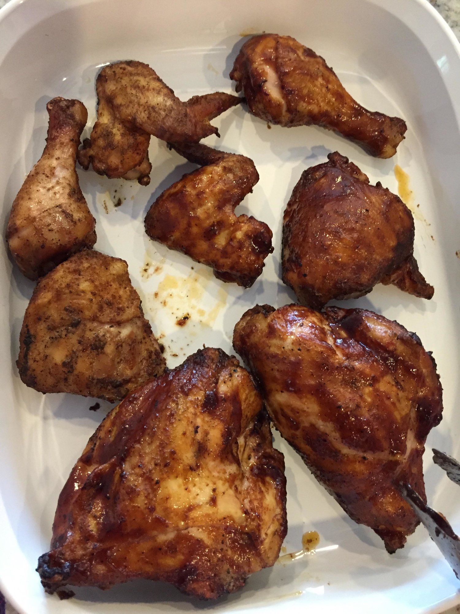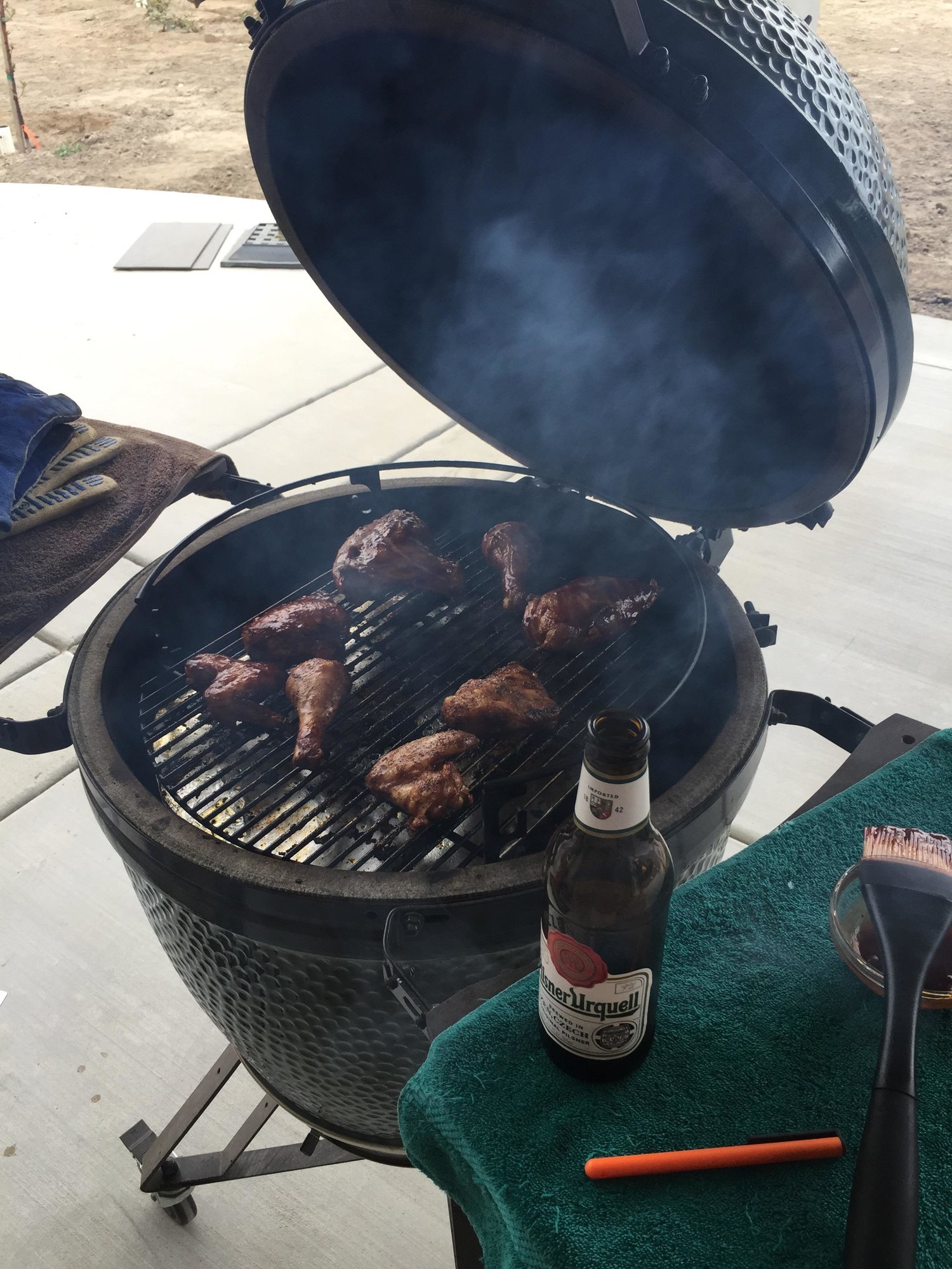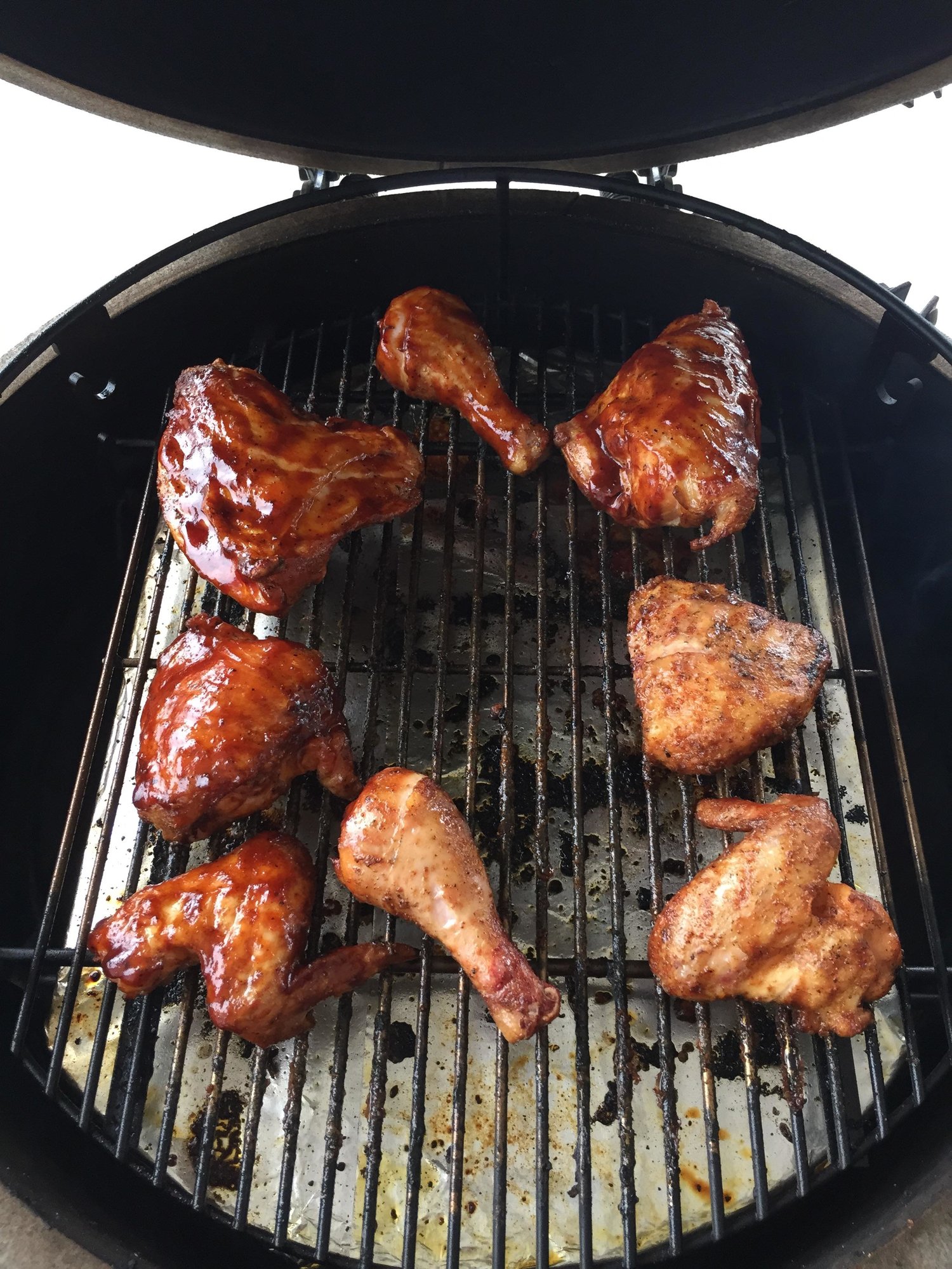 Nothing special but another enjoyable cook on the egg. Chicken parts, 375-400 degrees, indirect on the Adjustable Rig just below the felt line. Seasoned with EVOO, sea salt, and Ravens, and a handful of cherry chips. Took close to an hour after egg stabilized. Some parts sauced, some not to try to plz everyone. Tulare, CA - Large BGE