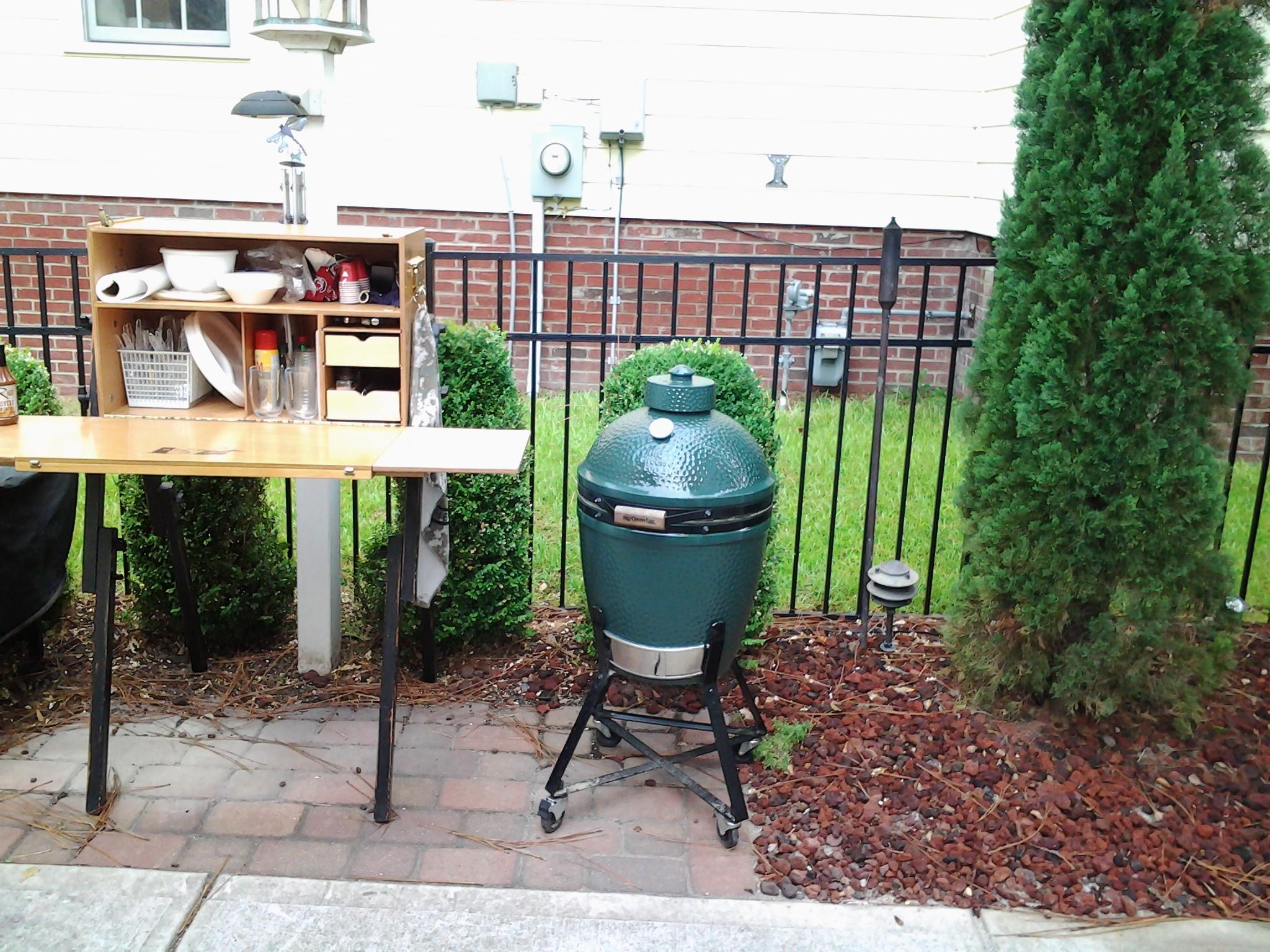 Finally my egg has moved back to the new deck. I am looking for ideas of something to put down to protect the trex decking. I checked HD and Lowes and the mats they have are brown and the deck is grey. Looking for other options. I do have a 4x4 piece of aluminum diamond plate, but not sure it will get the "approval".