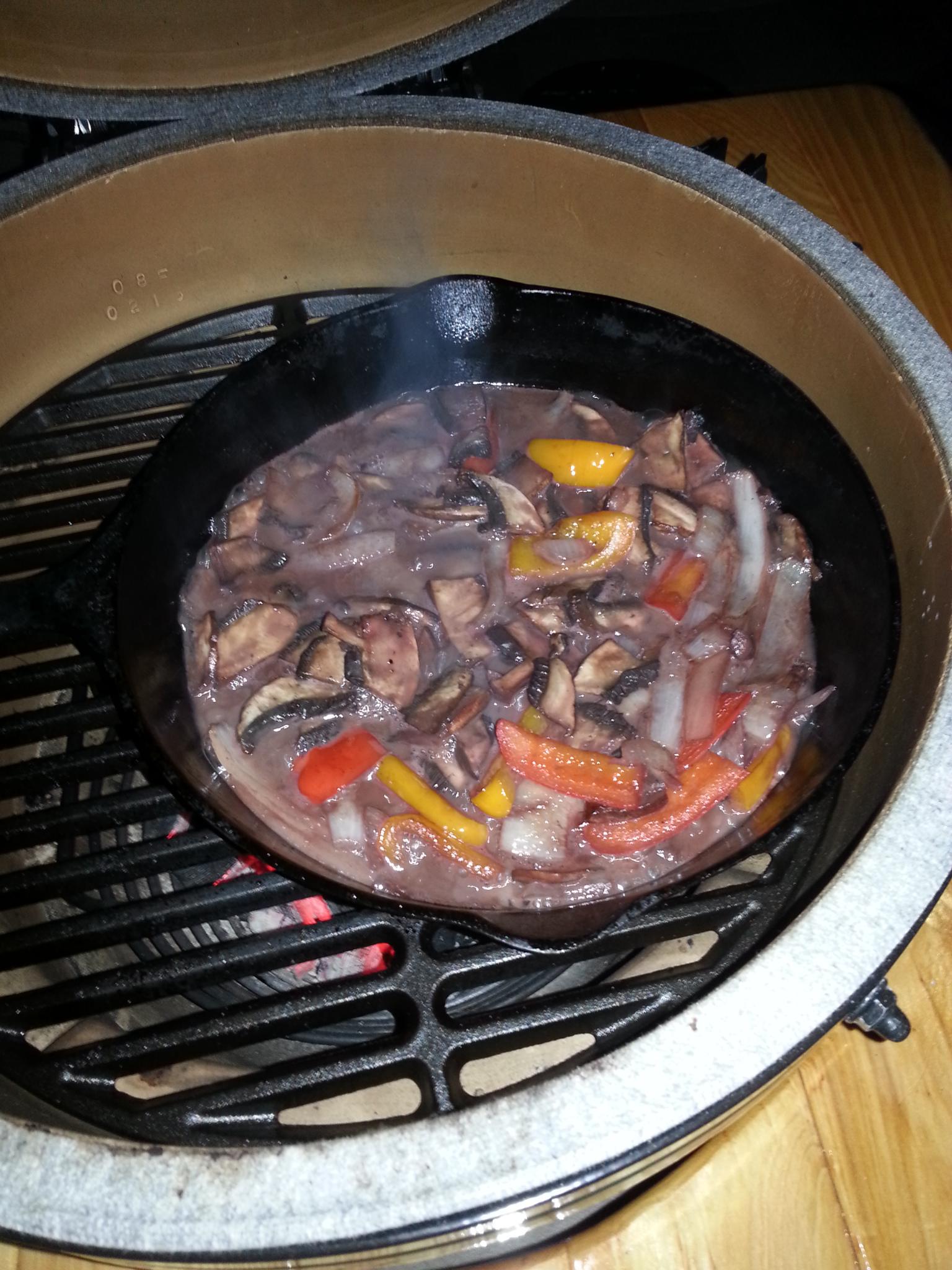 Nothing fancy tonight, but I know it will be some kinda good.  Ribeye steak rubbed with Ancho Expresso rub, onions-peppers-portabello shrooms, in the CI skillet with butter and Cab red wine, alongside baked potatoes.  My wife is making some veggies for herself. Cauliflower, broccoli and asparagus in an herb wine butter sauce.