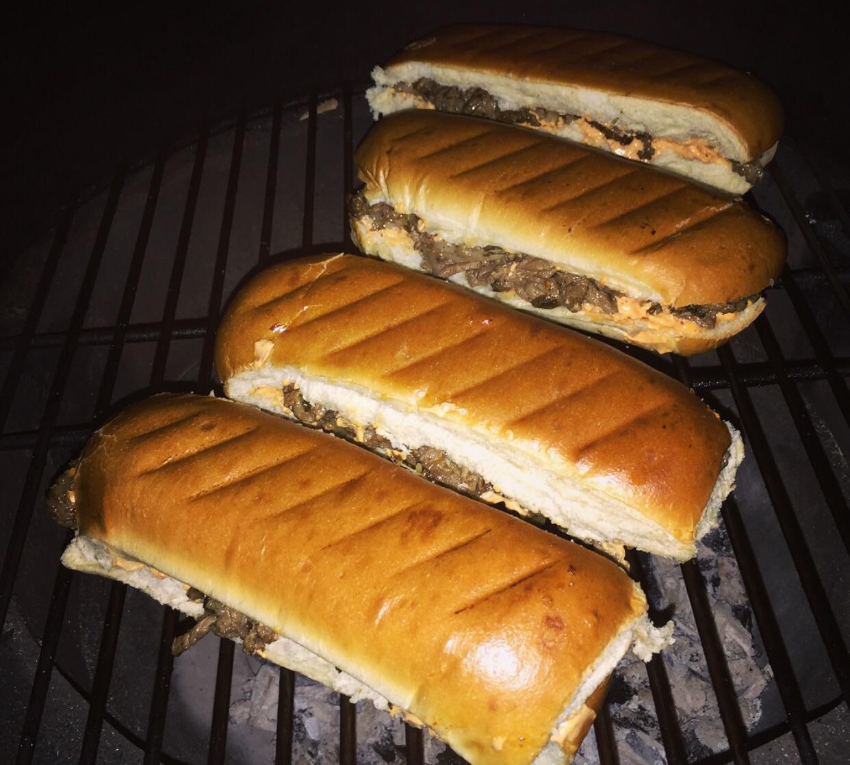 Thx y'all! For the cheesesteaks, I just used some deli rolls from Walmart's bakery. They actually have some great breads there. The meat was some sorta pre sliced steak ... Can't remember what they call it, but it's convenient for cheesesteak sandwiches. I ended up using the CI skillet to cook the steak. S&P with a little wood added to the coals. Pepperjack and homemade chipotle mayo.