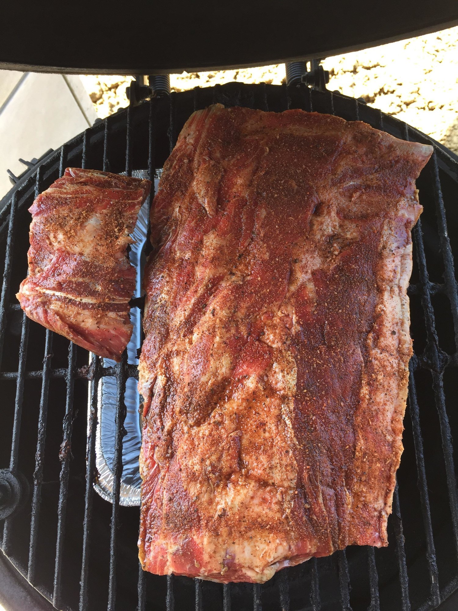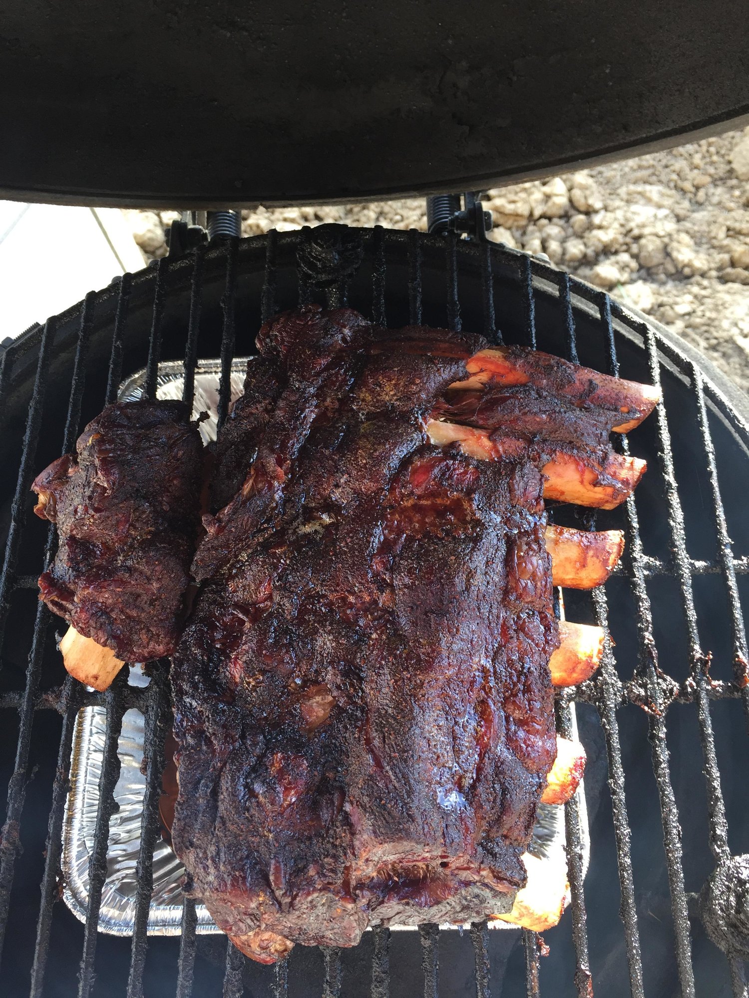 Finally moved into the new house enough that I can spend the day doing a low and slow. Wasn't planning on it but when I was walking through the grocery store and noticed these I knew I had to do them. Rolling at 270 with pecan and oak chunks. Slathered them with Allegro and then rub with DP Cow Lick. Haven't decided if I'm going to put them in the drip pan with some beer and onions after a couple hours or not. I've only ever gone straight through without foiling. Any one can provide some insight would be great.
