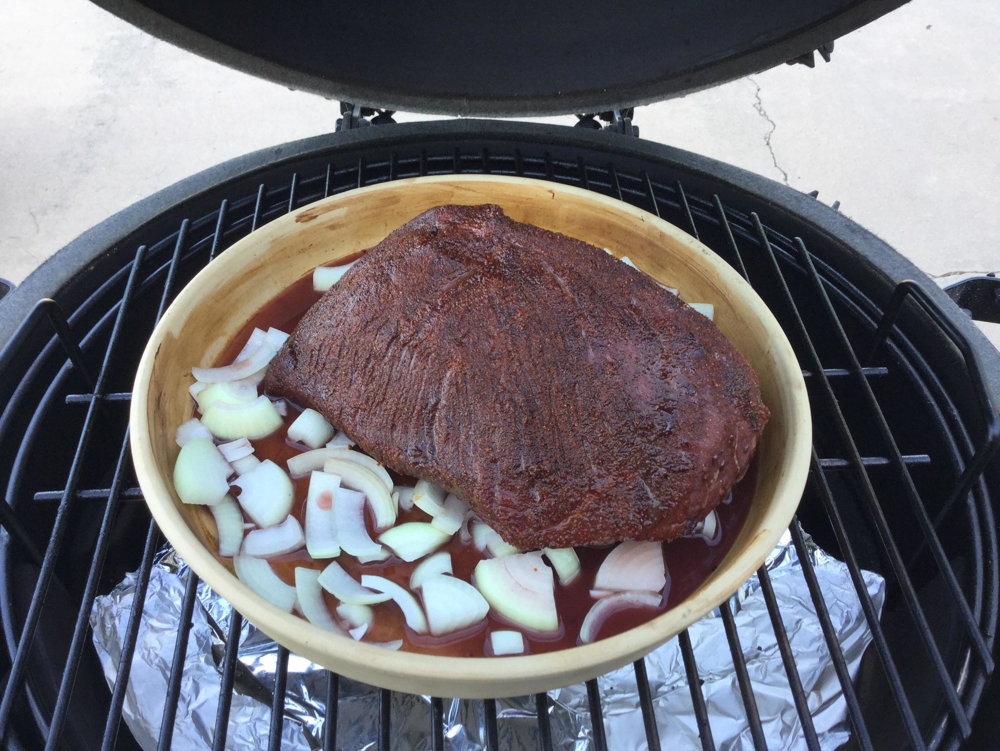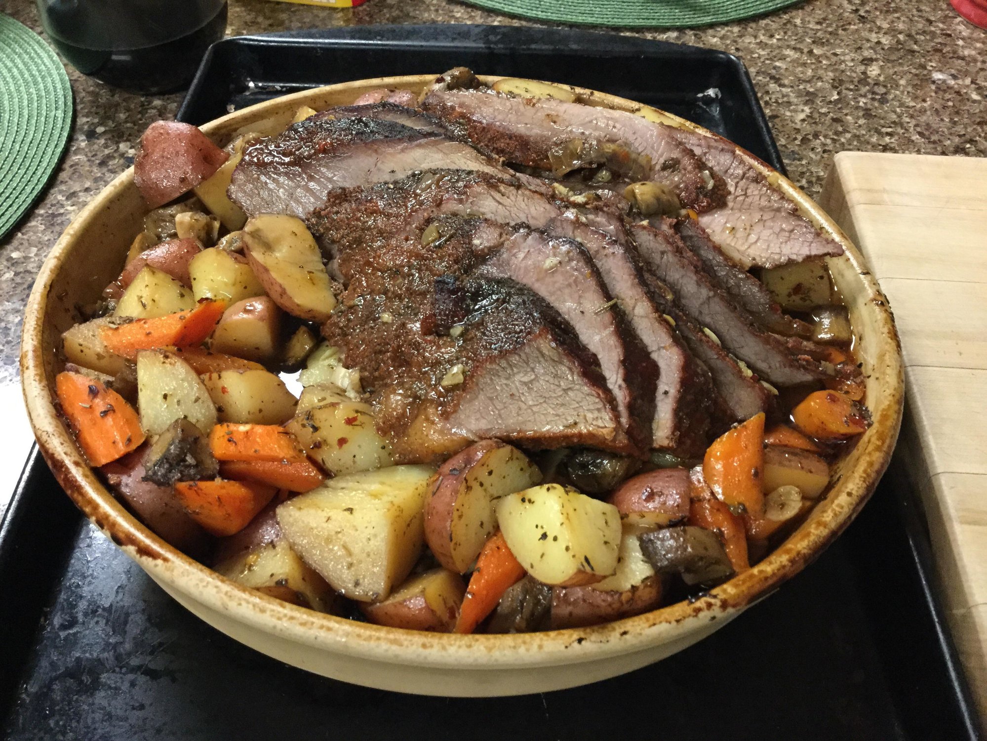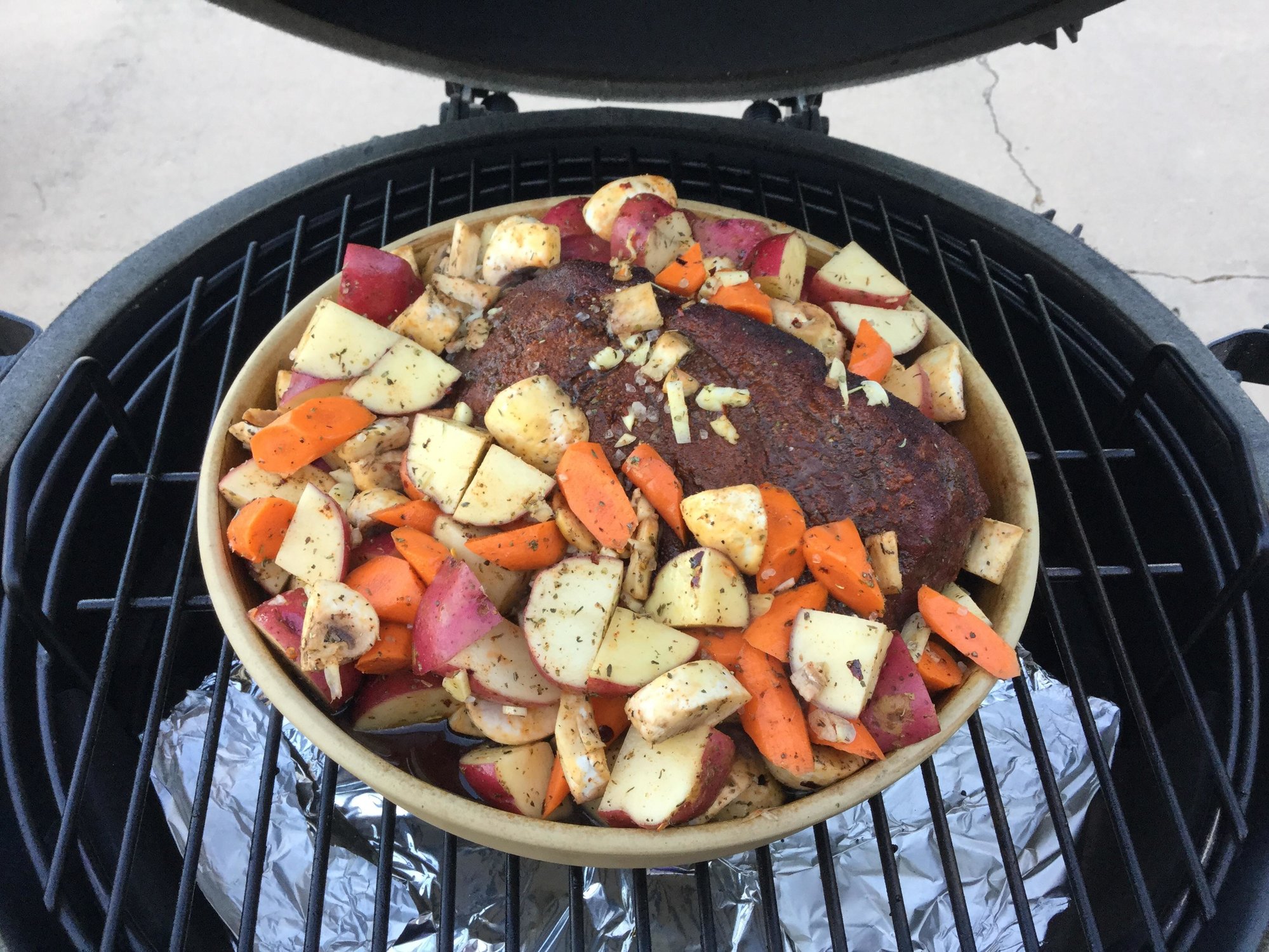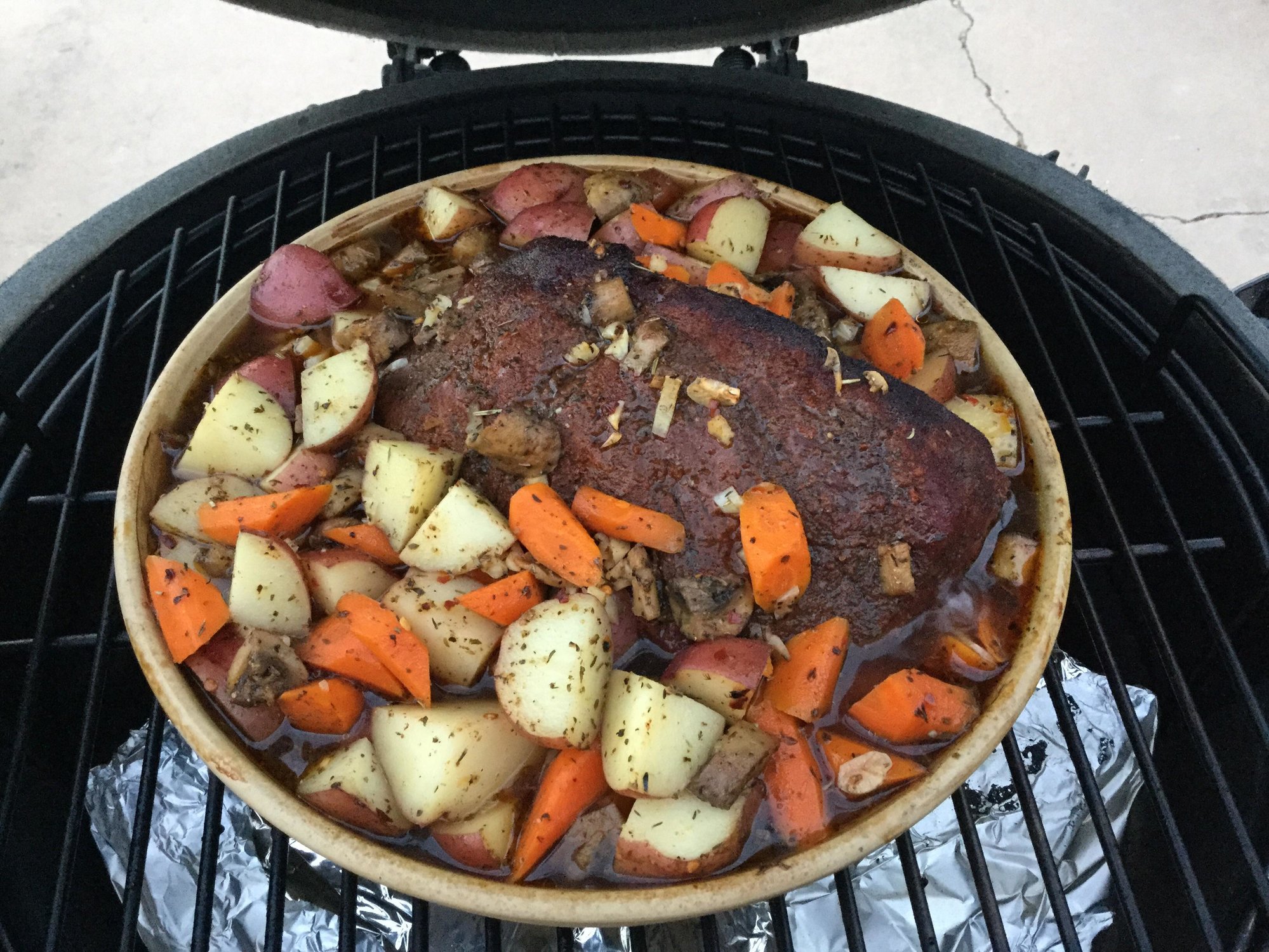 My plan is to smoke the roast @275-300 for about 3 hours (indirect.) Then I will move it to a covered stoneware dish. I'll add the veggies, seasonings, a bit of beef broth and wine. I hope to braise it for 1.5 hours or so and hope it's done by then.