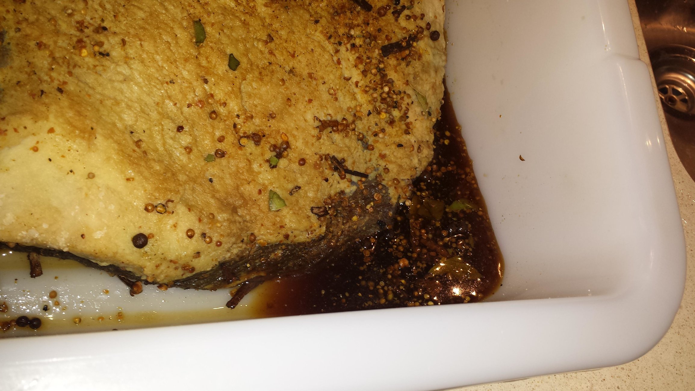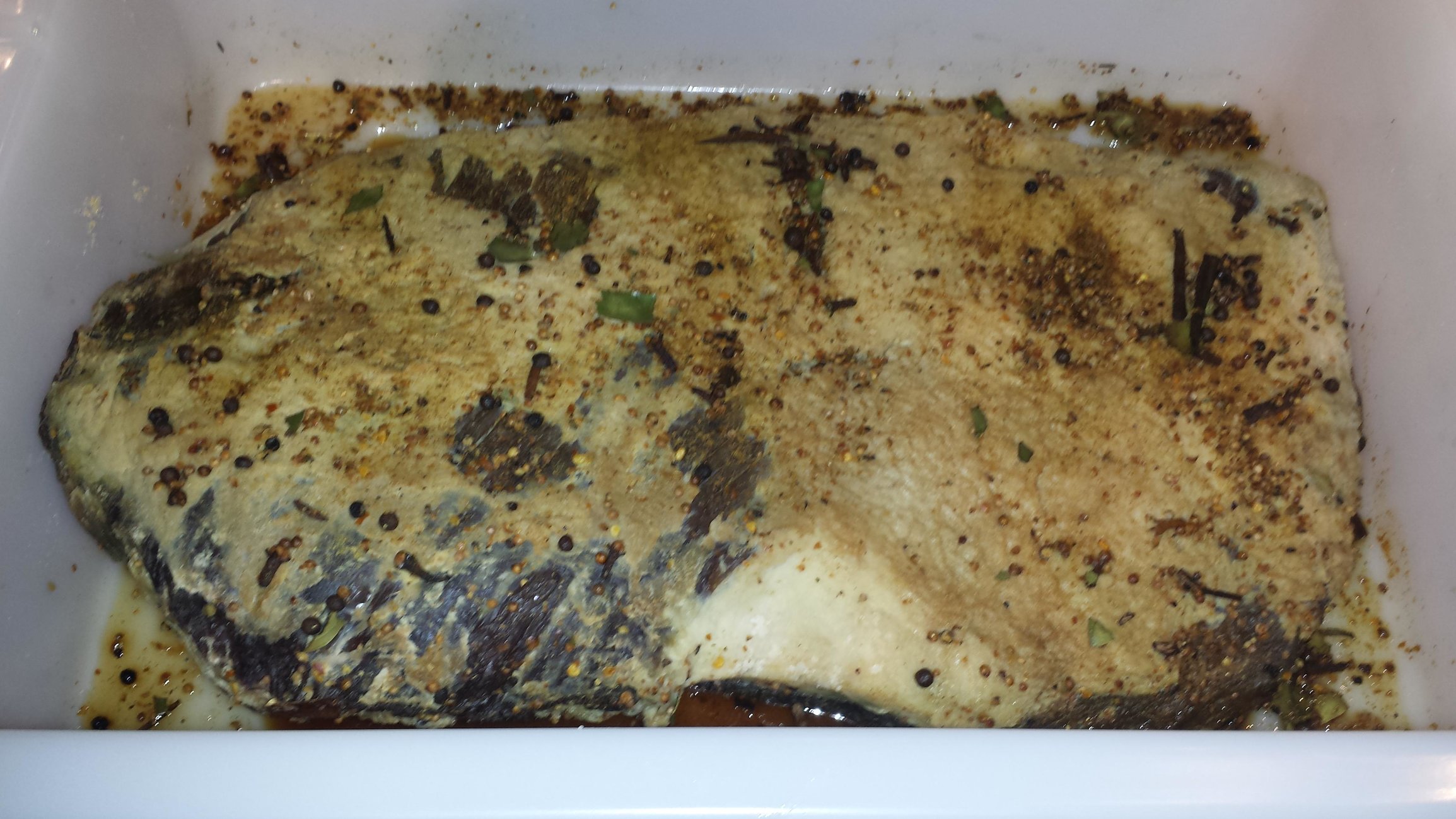 Rubbed with roughly 2 teaspoons of pink curing salt per side, 1/2 cup kosher salt, some brown sugar and homemade pickling spices. I did not really measure...