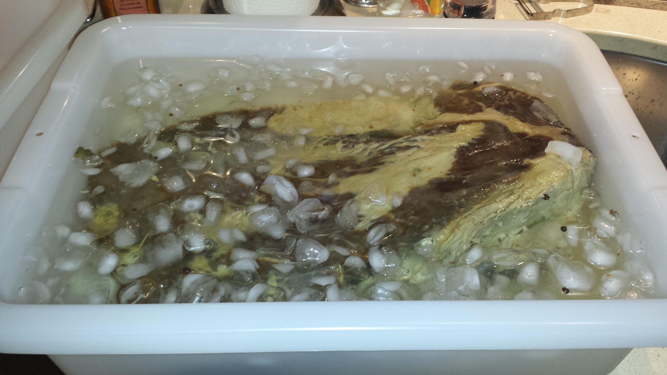 Wednesday September 30th, after 8 days of dry cure, turning it twice, I rinsed the brisket to remove the spices and it is now soaking in ice water with roughly a cup of sugar to get rid of some salt. It feels quite firm and has a mostly brownish color with some greenish hues neer the fat. It smells good so I am not too concerned. It is a bit premature but I think that I nailed it, the smell is like when you enter at Schwartz. I will let it soak until tomorrow and change the water one more time. I will then dry it and rub it with actual Schwartz seasoning. It will dry for one night before going on the egg saturday morning.