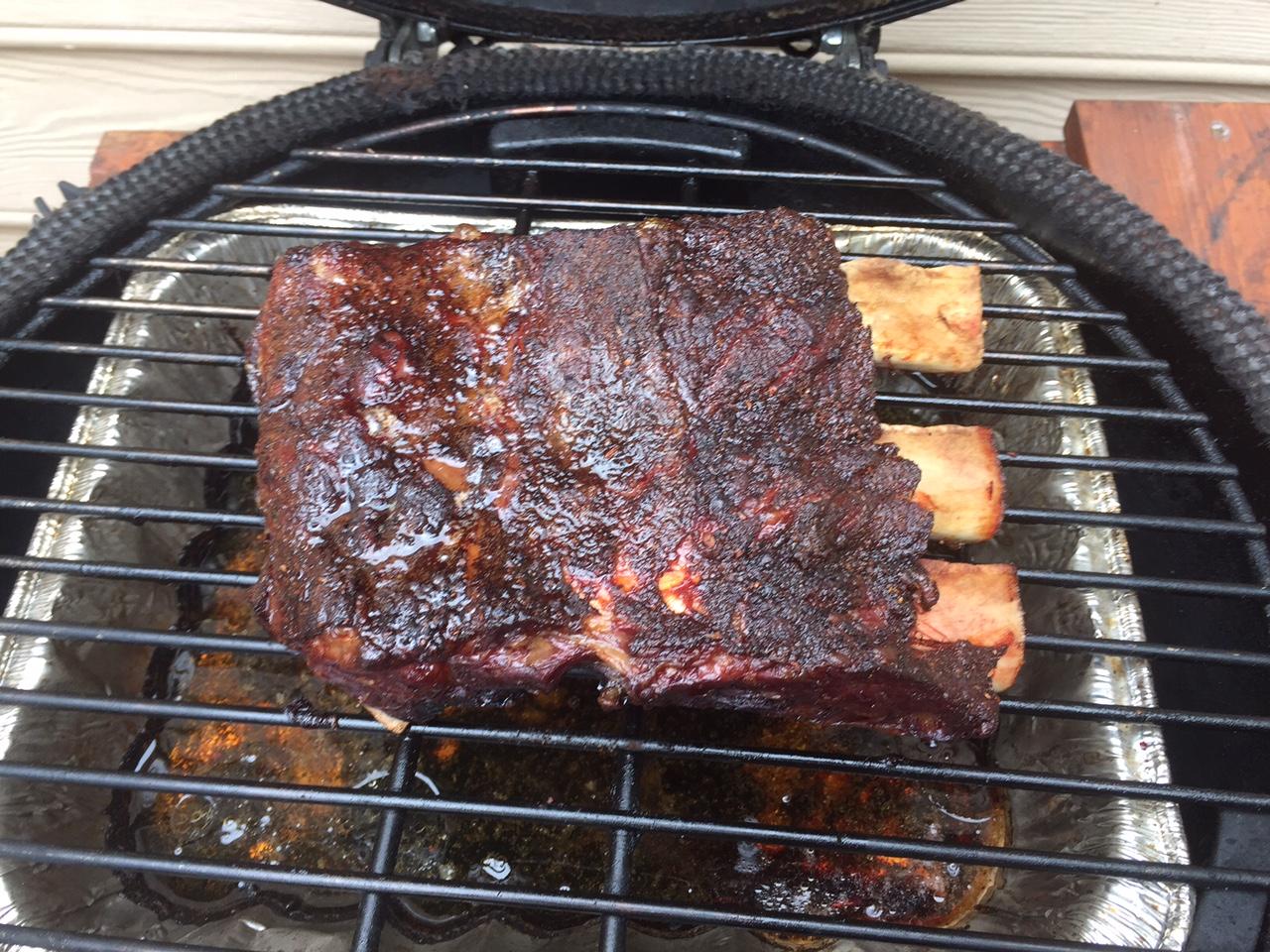 Haven't done beef ribs on my MBGE yet. Done lots of spares, and employ the turbo method with great success. Dizzy pig red eye rub, mix of apple & cherry, 275-325 dome temp, until they bend but don't break (~3-4 hours). FTC afterwards is the only time they see foil. Can I use the same method on the cow? I'm not sure red eye rub is the play.... it has sugar. And I will throw some hickory or mesquite chips in, instead of apple/cherry. Any other coaching, Eggers?