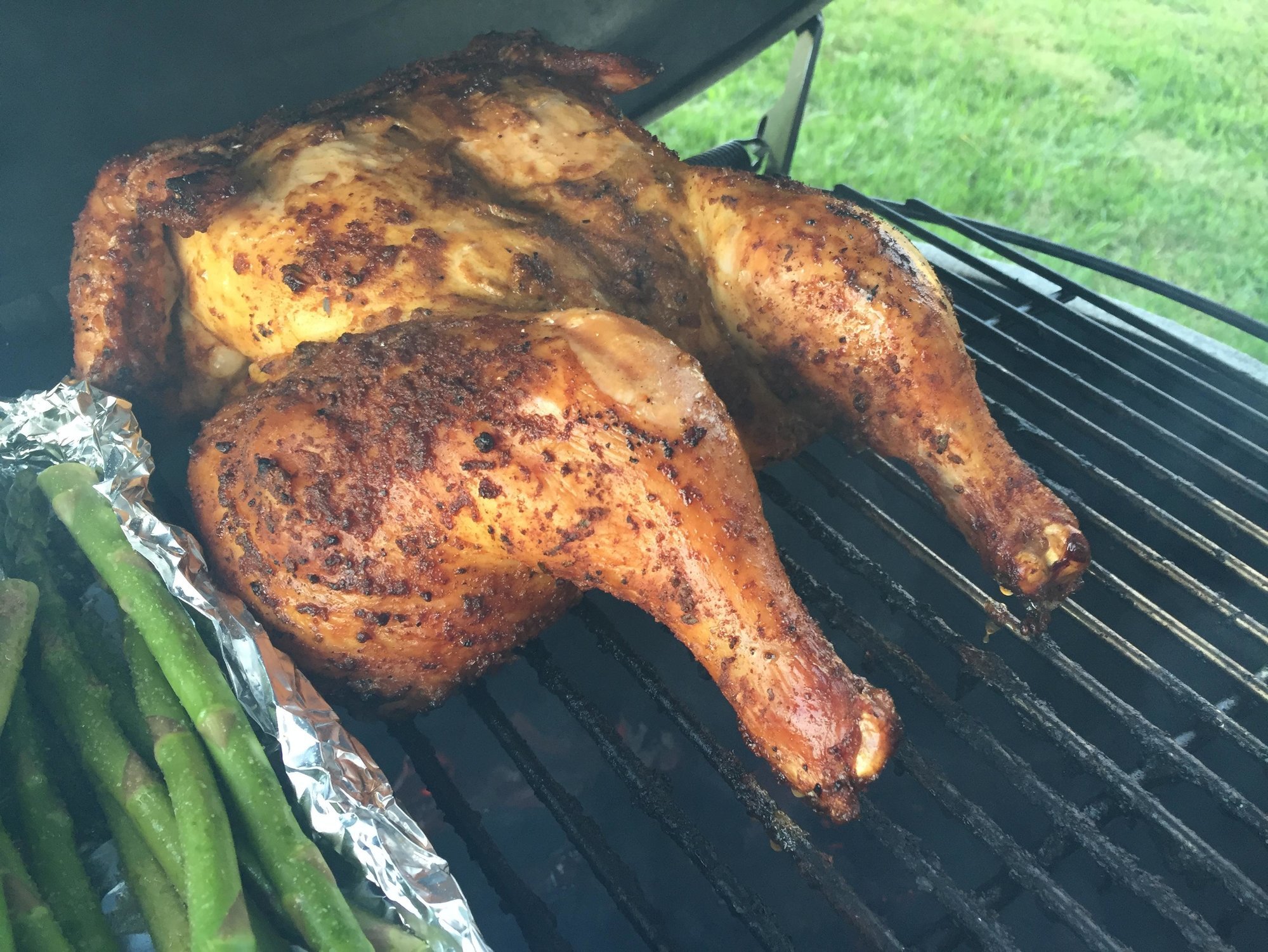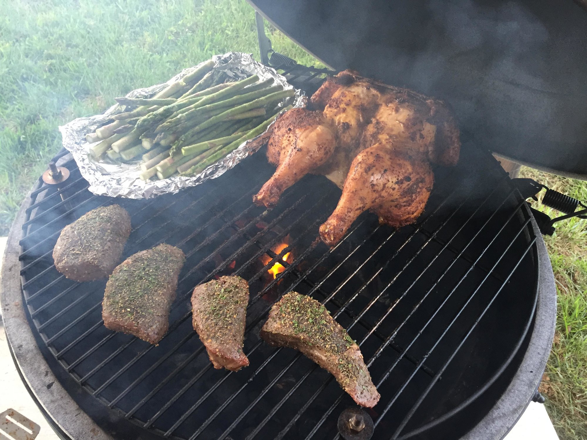 I've started liking my asparagus a little al dente?? So I put them on and the filets when the chicken needed about another 20 minutes. Then I opened it wide, took chicken off foiled and did aspergillosis a little on the grate with flames. Foiled that then threw the filets around 120's on the coals for a minute.
