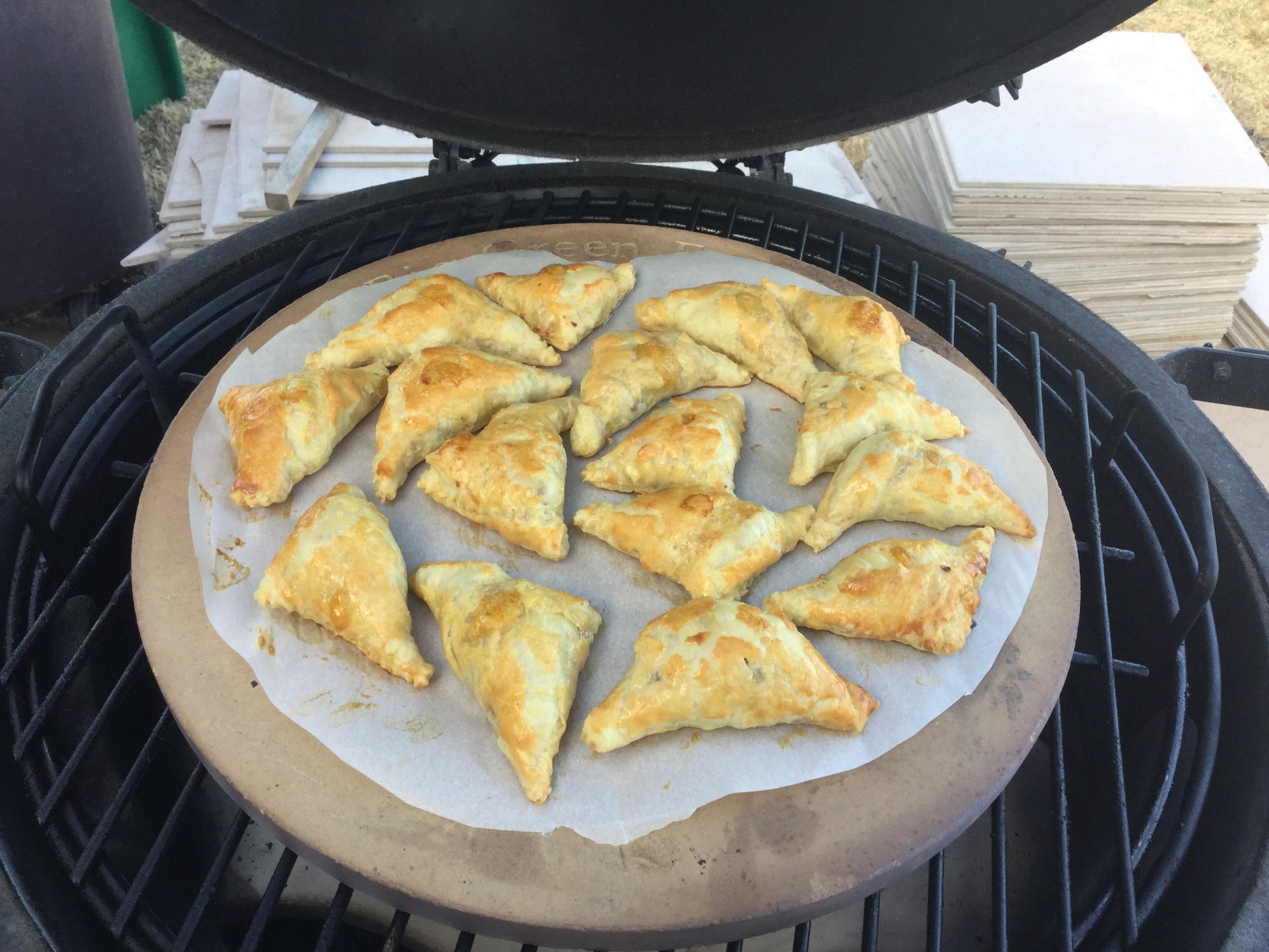 The egg was just idling until about halftime during the Aggie game. I tried baking some empanadas using puff pastry dough. I cranked it back up to 400 degrees and cooked the empanadas for 20 minutes. Then I pinched off the dampers to lower the temperature again.