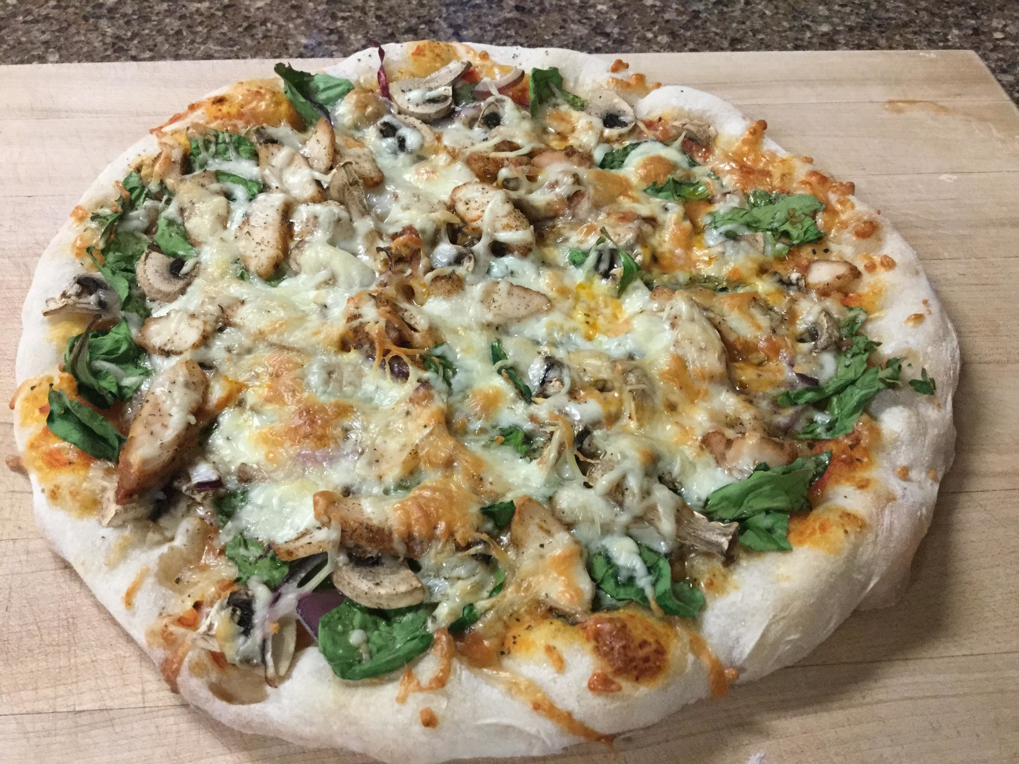 Thanks! It was grilled chicken tenders seasoned with DP rub, mushrooms, spinach, mozzarella, and pizza sauce. I used 00 flour - I'm now a fan for thin crust.