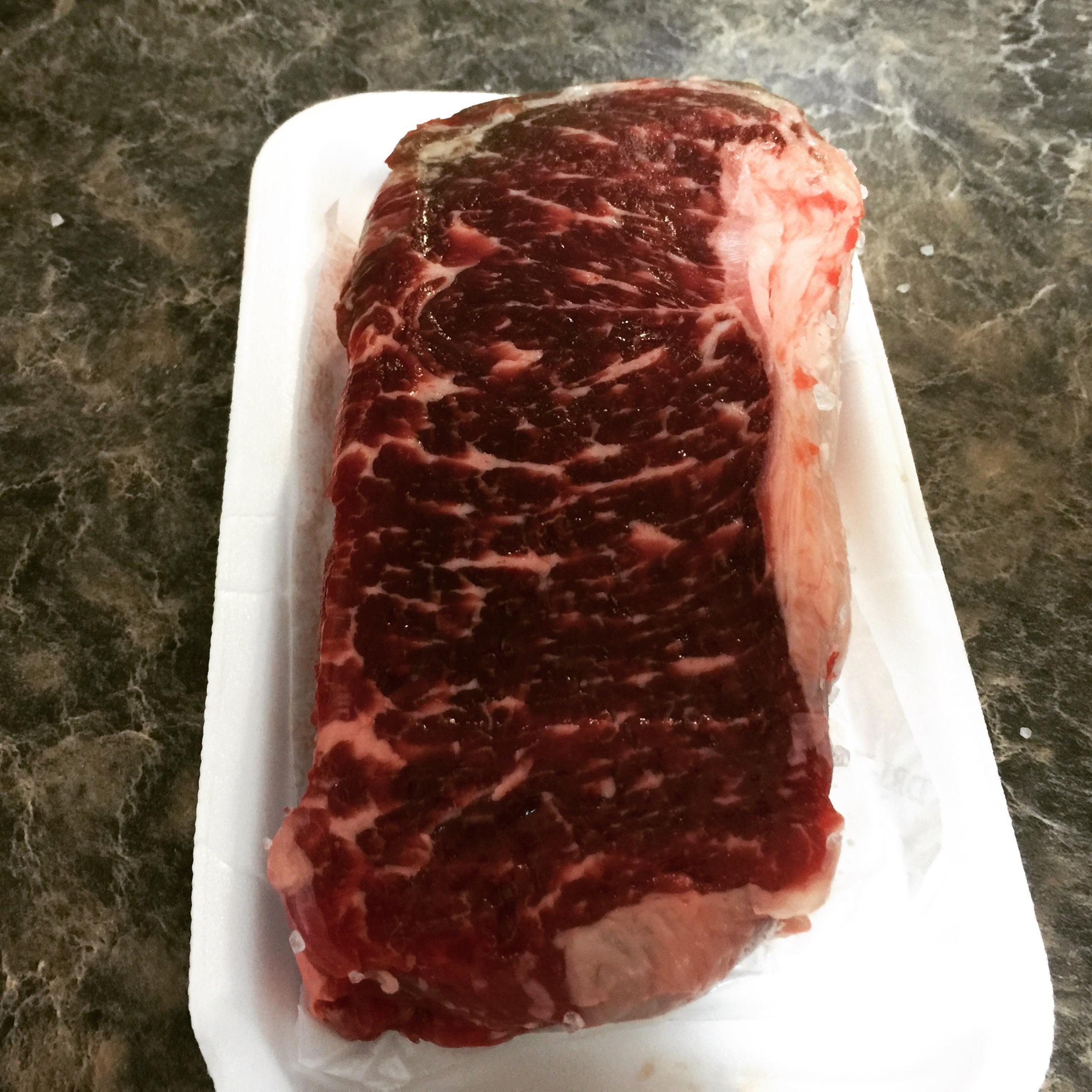 My wife found this beauty hiding in the midst of terrible looking ribeyes. Someone mispackaged this thick strip steak as a ribeye. It had the best marbelization I've ever seen on a strip. Only thing I can think of is that the butcher set it aside for himself, and it somehow ended up being mispackaged. Not complaining. It was one of the best steaks we've ever eaten. Seasoned with ample amounts of course sea salt, cracked pepper and butter.