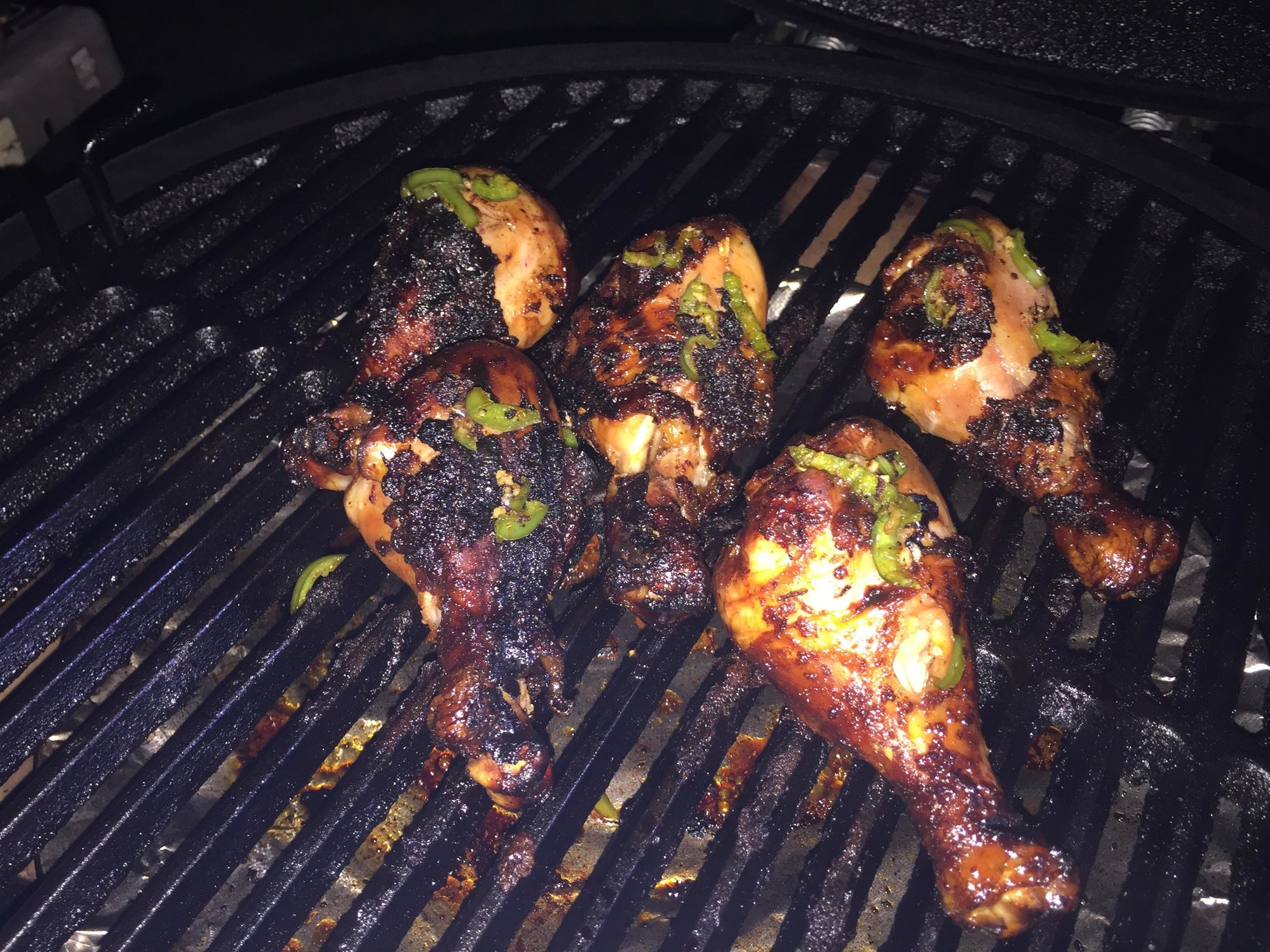Legs are brined all day, rubbed and smoked indirect over apple for 45 minutes. Grilled direct 3 minutes a side and then rolled in a glaze and back to indirect for 10 minutes. Pulled on a cutting board and served as sandwiches. Excellent smoke flavor and a wonderful taste all around.