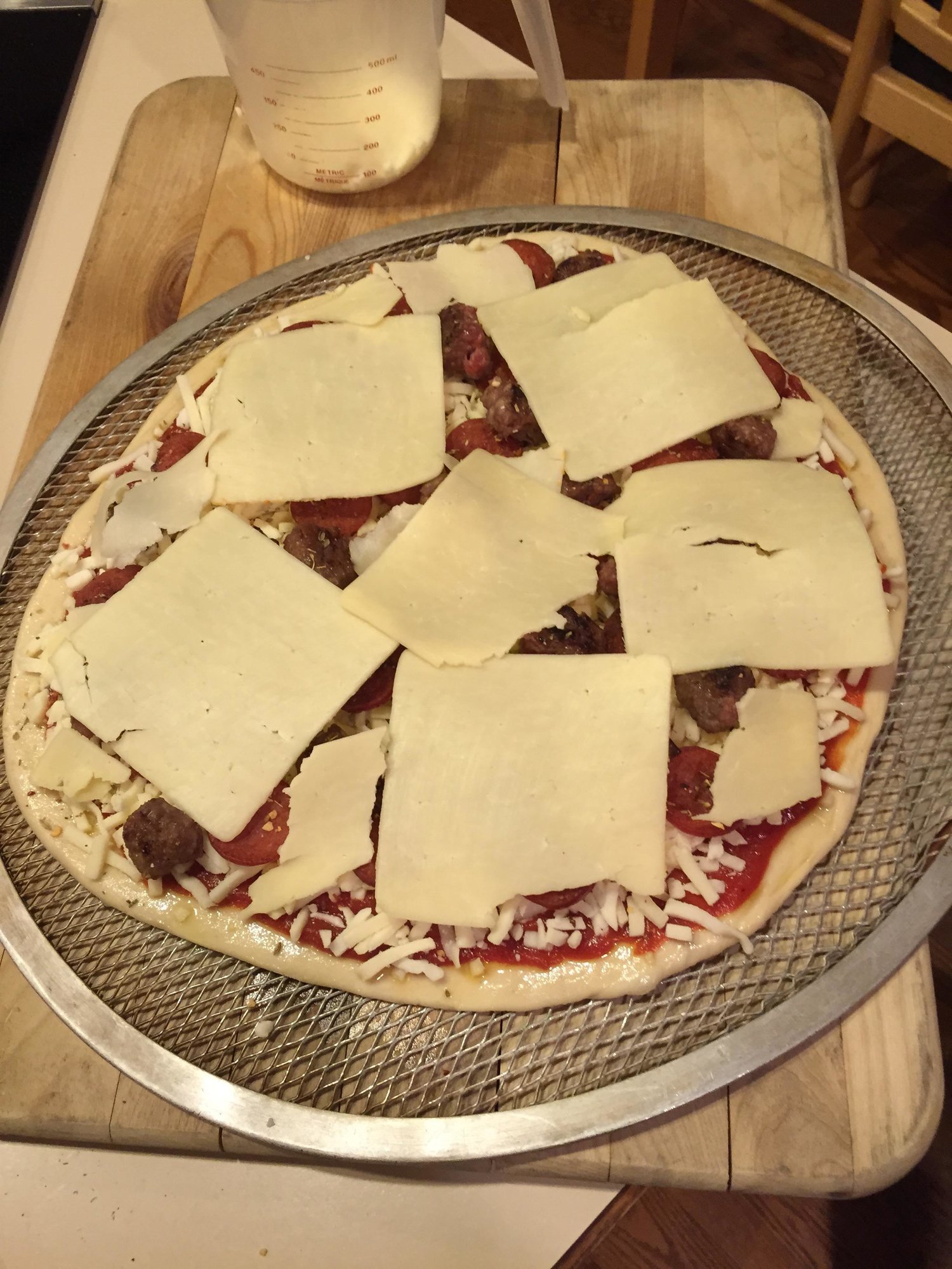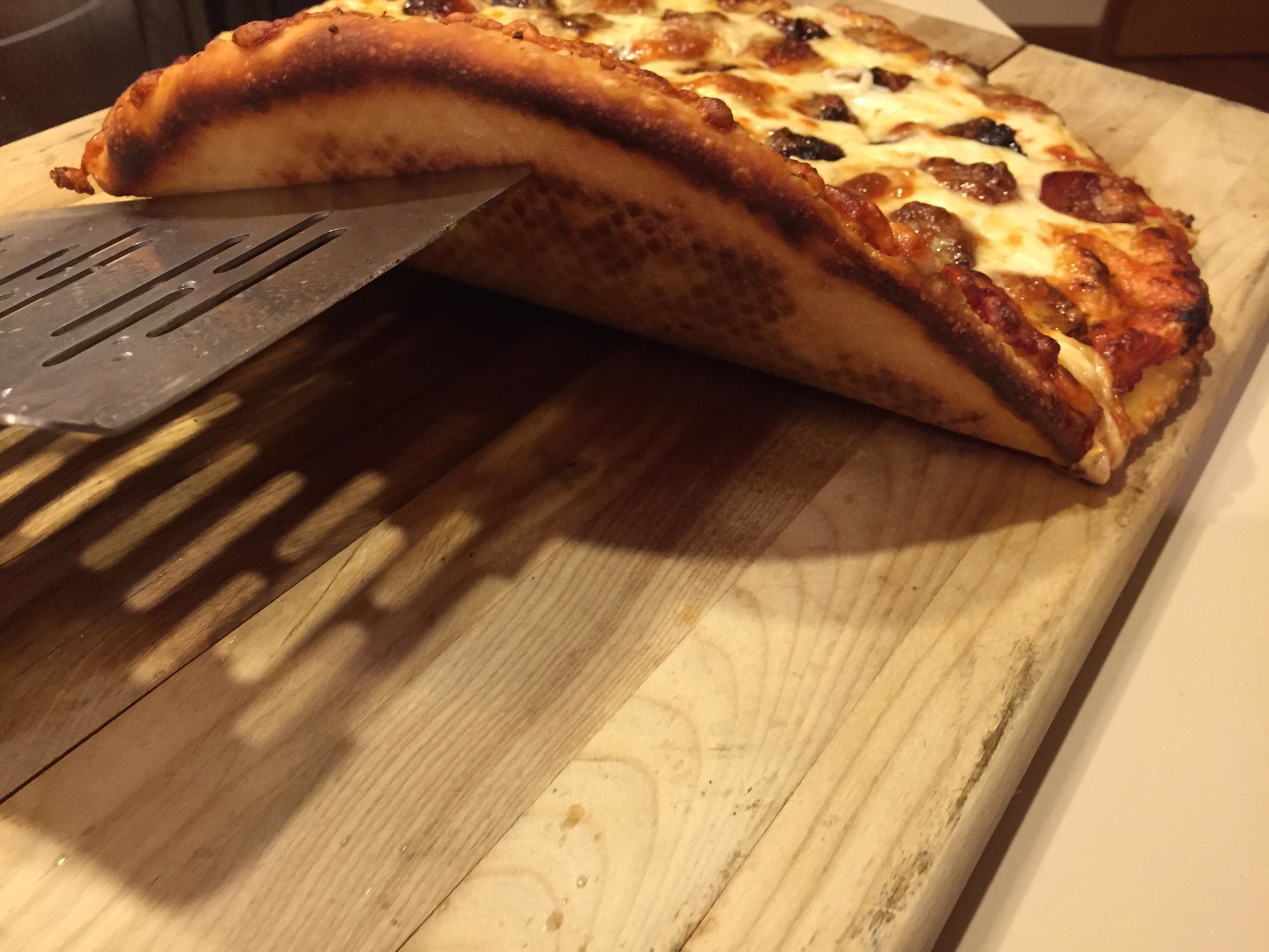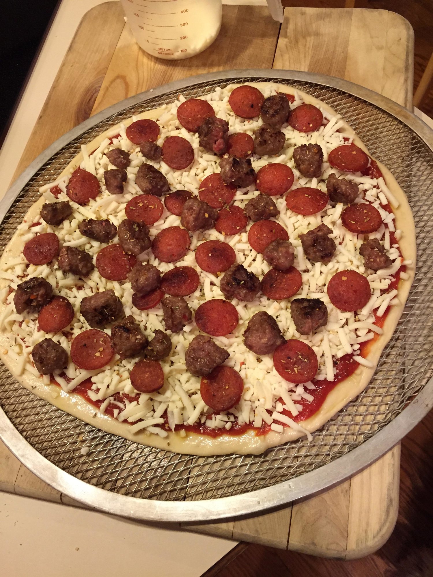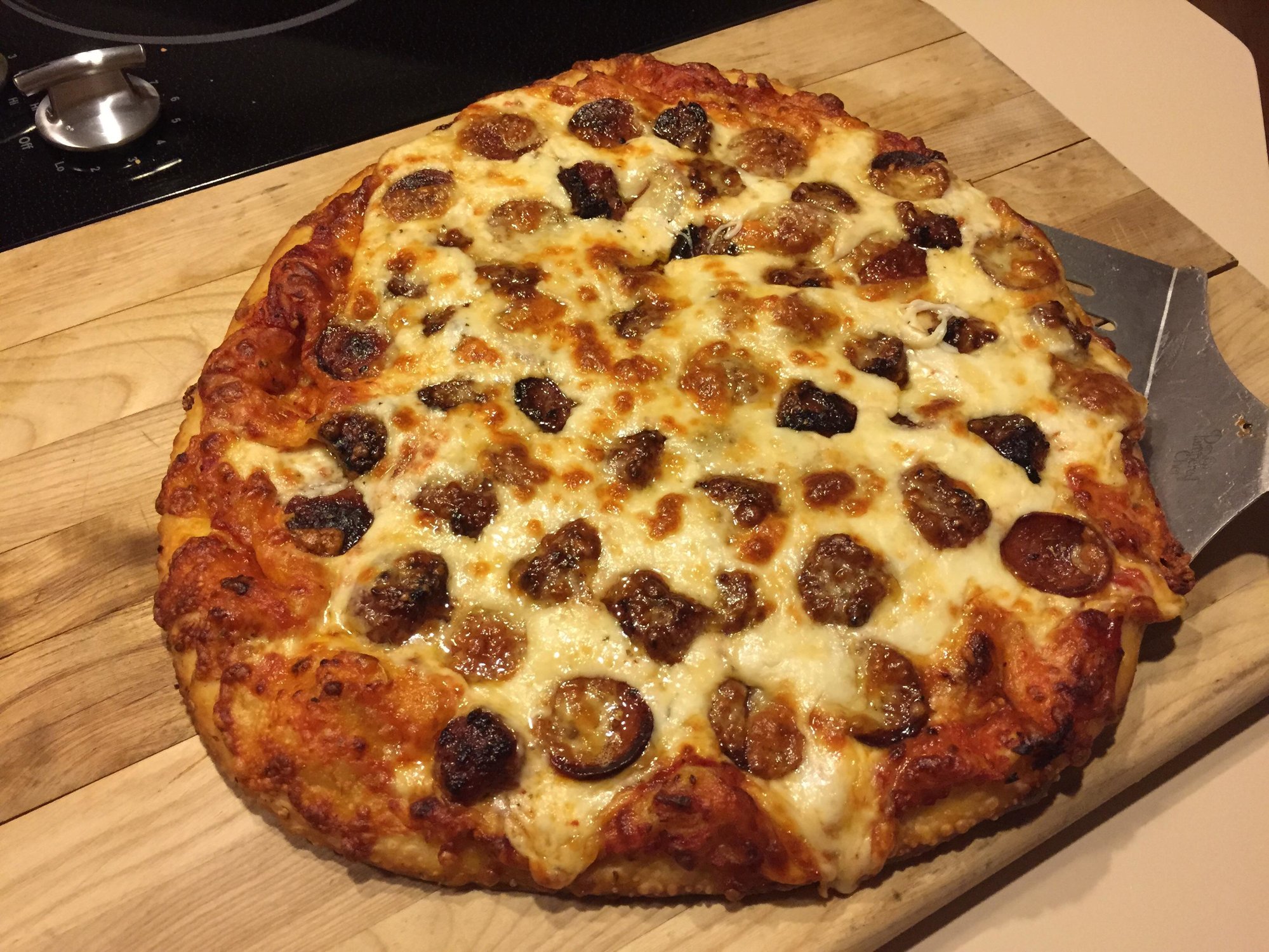 First pizza cook in a couple months, 12 inch dough rolled to about 13/14 inch store bought Mids pizza sause 50/50 Motts & Provalone, pepperoin, mild sauage then a thin layer of white cheddar baked at 500 until the bottom & top look like the top of a loaf of white bread (we like pizza well done) about 13/14 minutes