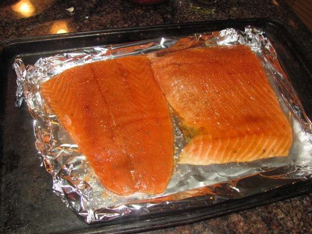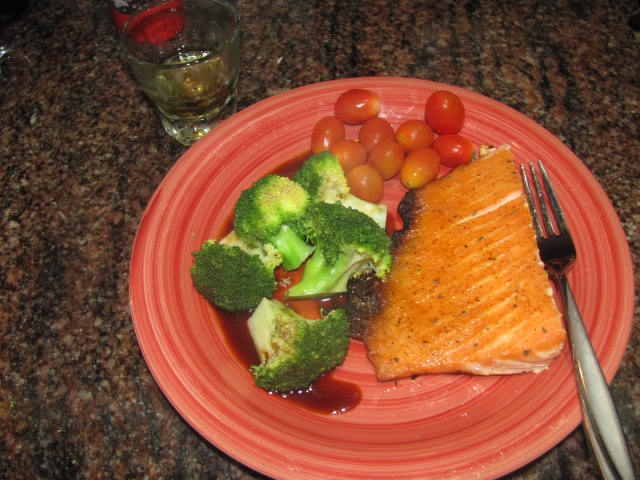 5 oz grilled salmon, steamed broccoli, and 10 cherry tomatoes.
