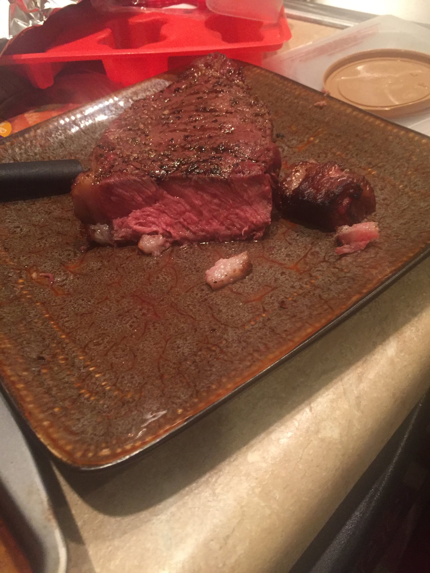 The great thing about my SAMs club is everything is at least 1" thick. After 25 minutes on the back I removed and did a reverse sear. The lady really only like medium but she ate this steak like they are going to outlaw it tomorrow. I might be able to make to teach her! Haha